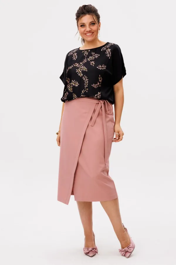 Запах формирует посадку и позволяет регулировать её под себя - изнутри можно перенести пуговицу, поэтому размер адаптируется и идет в сдвоенной градации. Ткань легкая, не перегружает образ, юбка движется вместе с вами и легко вписывается в повседневный ритм.