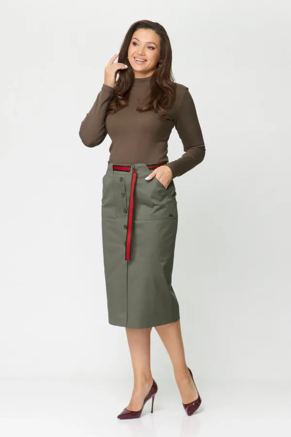 Юбка женская из хлопковой ткани. На подкладке, прямого силуэта, заужена к низу. Притачной пояс-кокетка, настрочены по переду накладные карманы и обработана по центру планка, которая заканчивается шлицей. Спинка со средним швом и талиевыми вытачками. В среднем шве застежка на потайную тесьму-молнию. К юбке прилагается пояс. Длина юбки по боковому шву 68 см.