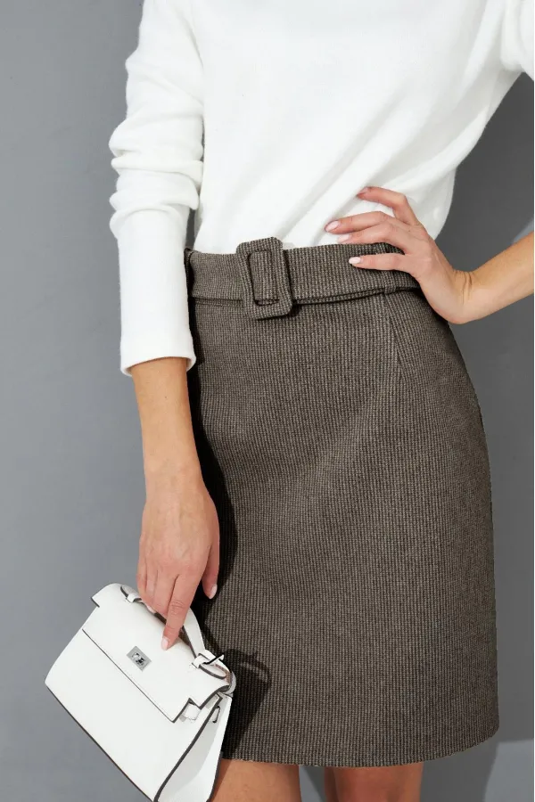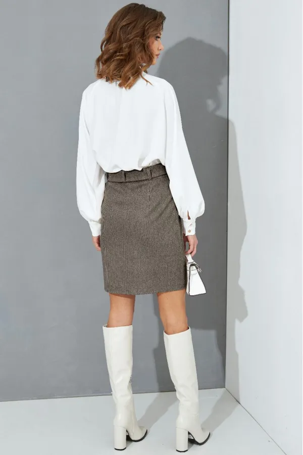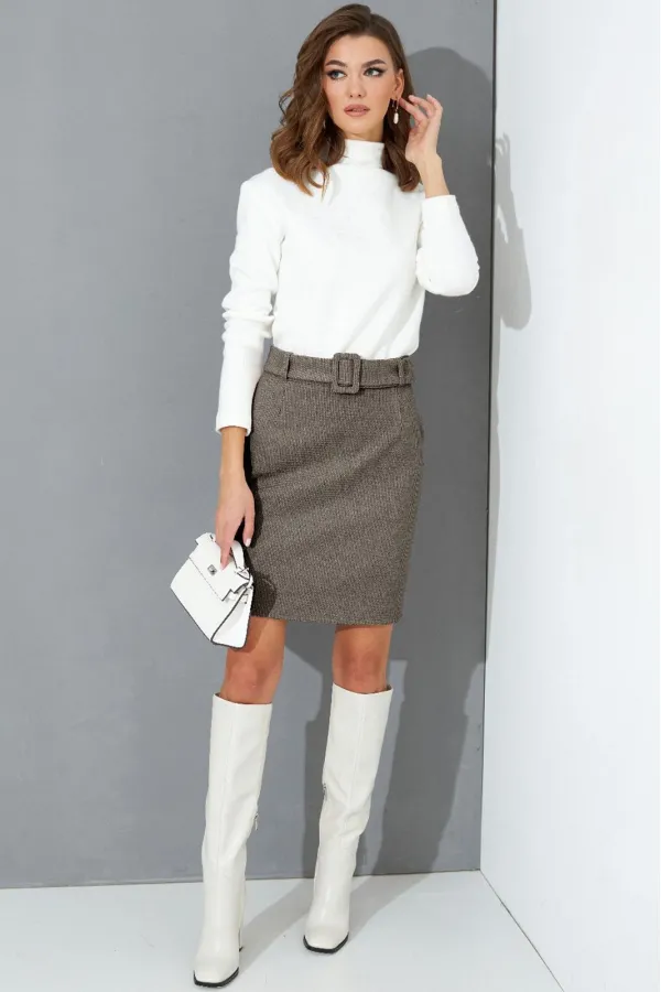 Юбка из костюмной ткани, прямого силуэта, на притачном поясе со шлевками для ремня, без подкладки. Переднее и заднее полотнища с вытачками. В боковом шве потайная застежка на молнию. В комплект входит съемный ремень из основной ткани.