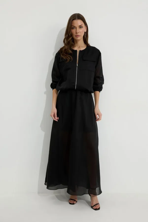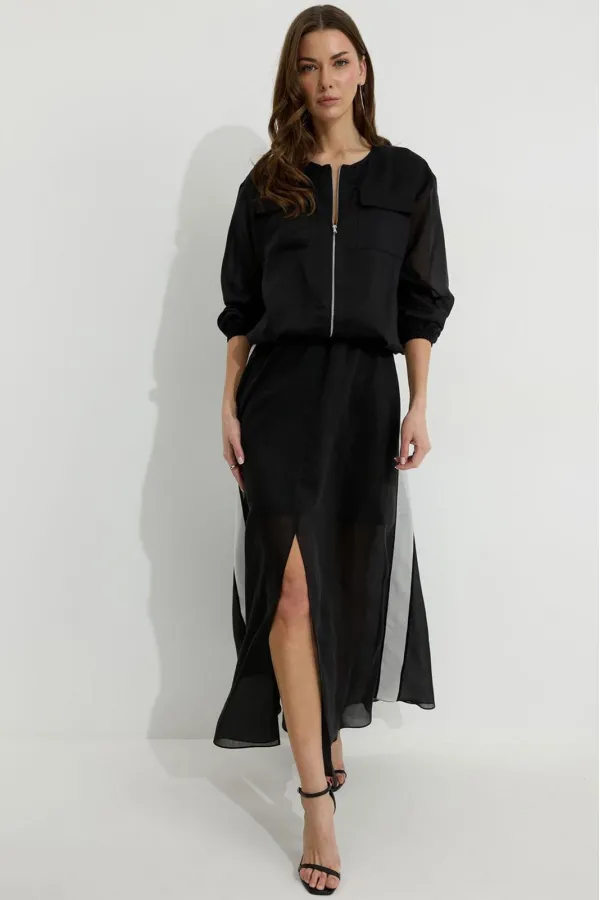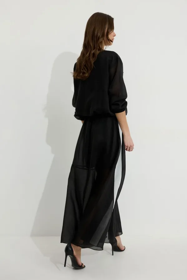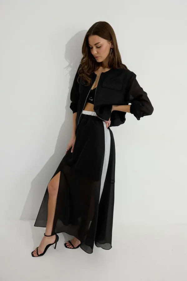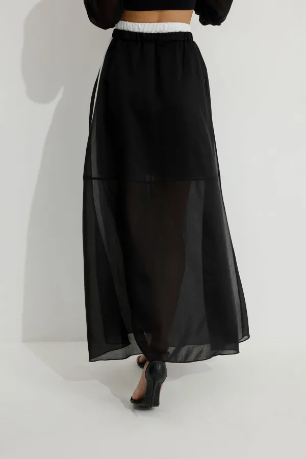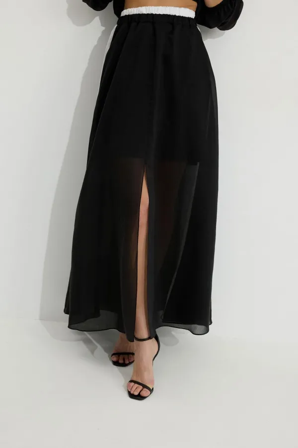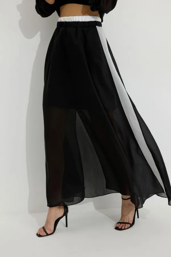 Юбка из вискозной полупрозрачной ткани. Расширенного А-образного силуэта, длина макси. В юбке двойной пояс на резинке. Верхний пояс контрастного цвета. Спереди разрез. Заднее полотнище юбки с подрезом немного выше линии колена; нижняя часть с дополнительным расширением. По боковым швам лампасы контрастного цвета. Юбка на подкладке.