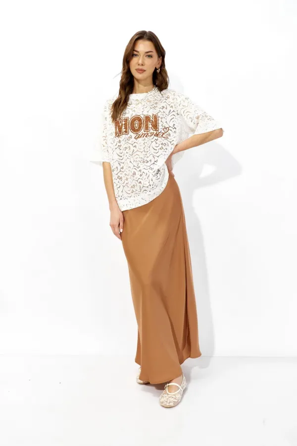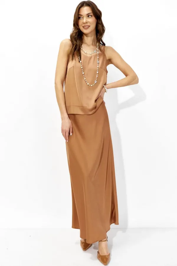 Элегантная юбка А-силуэта из струящейся ткани. Пояс собран на эластичную тесьму.