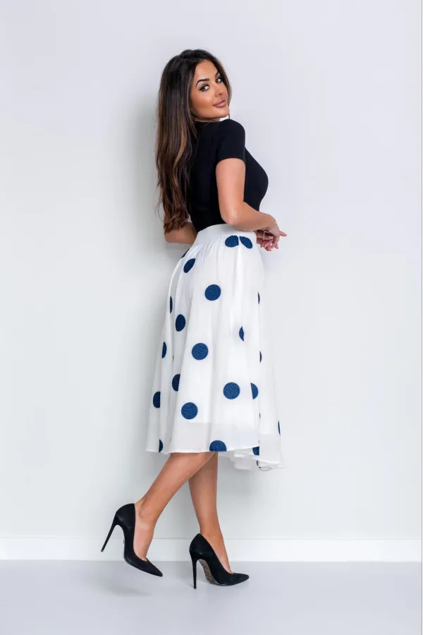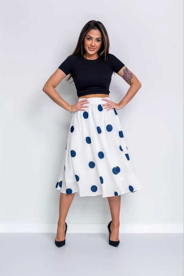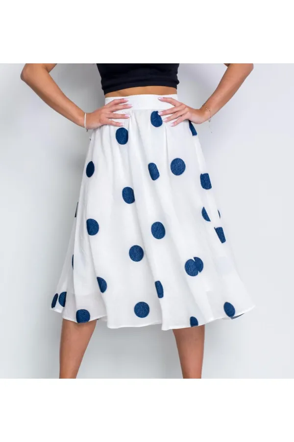 Юбка белая женская или юбка светлая в горошек длиной ниже колена - идеальный вариант на любую пору года. Юбка на резинке отлично подойдет для прогулки по улице и для офиса. Юбка светлая в синий горох на подкладке. Основные изюминки изделия: Юбка женская А - силуэта с притачным поясом на резинке. С тонкой текстильной подкладкой. Из легкого интересного фактурного материала с крупным жаккардовым синим горохом. Женственная, стройнит, не мнется, струится. Визуально вытягивает вашу фигуру и делает стройнее. Деловая и элегантная женская юбка сочетается в коктейльный образ с пиджаком и джемпером так как может заменить брюки.