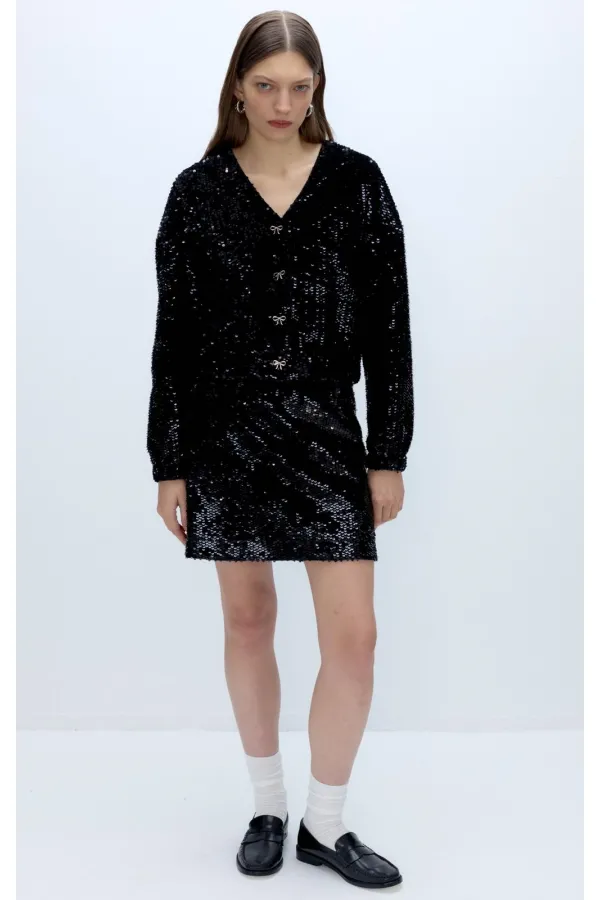 Мини-юбка из велюровой ткани в пайетки. Детали: юбка трапециевидного силуэта, талиевые вытачки, потайная застежка, на подкладке. Длина юбки по боковому шву около 43,5 см в размерах 40-46 и около 46,5 см в размерах 48-52.... Читать далее...