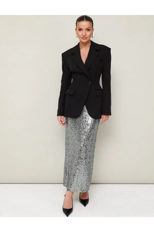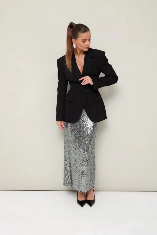 Юбка, декорирванная пайетками, на подкладке. Пояс на резинке,хорошо тянется. Юбка прямого полуприлегающего силуэта.