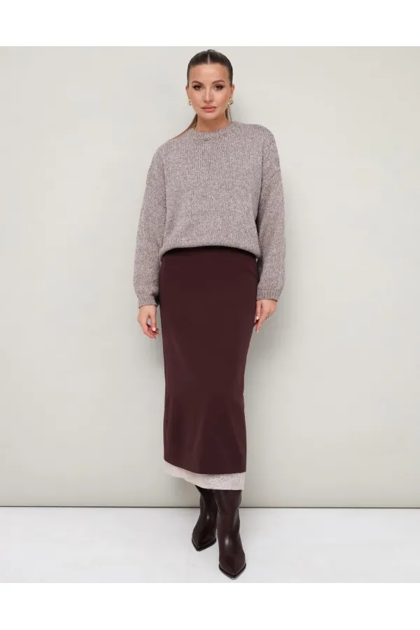 Юбка-карандаш прямого силуэта в длине миди. Верхняя юбка выполнена из костюмно-плательной ткани, пояс на обтачке, застёжка на потайную молнию в среднем шве по спинке. Нижняя юбка на резинке по поясу, низ обработан кружевной отделкой с сеткой. Для удобства движения сзади по юбкам обработаны разрезы.