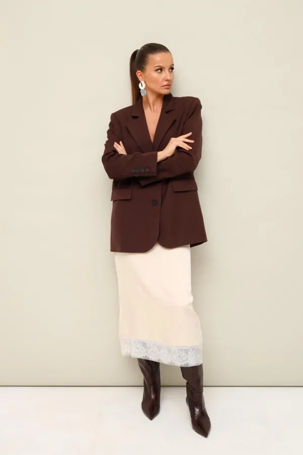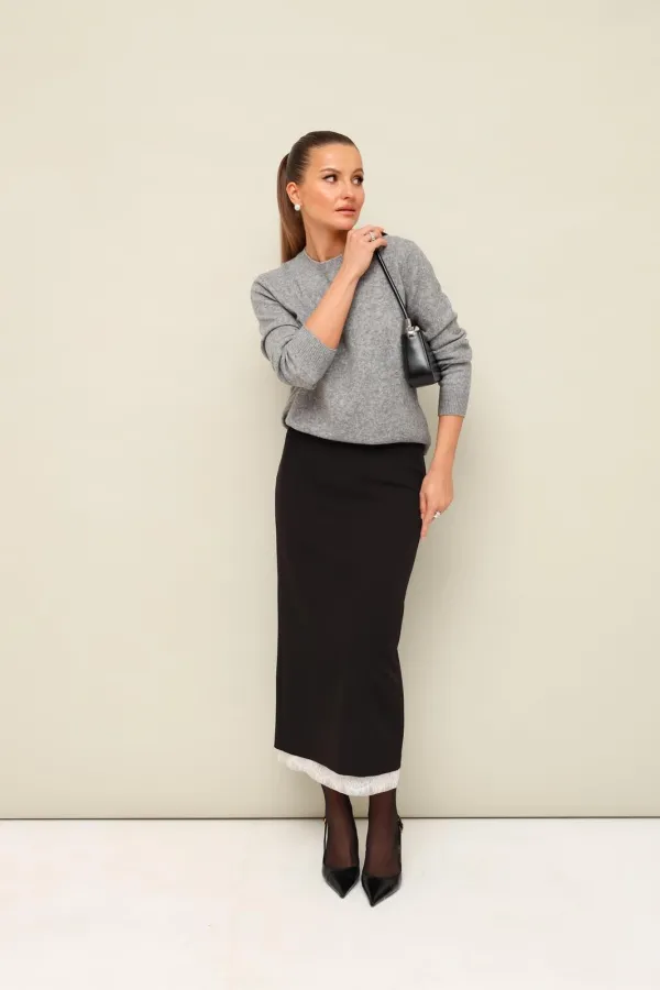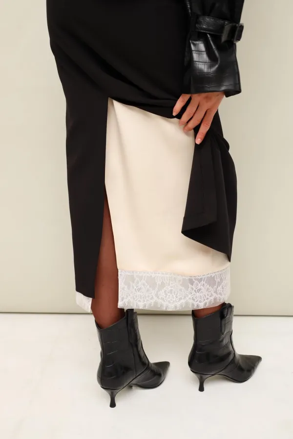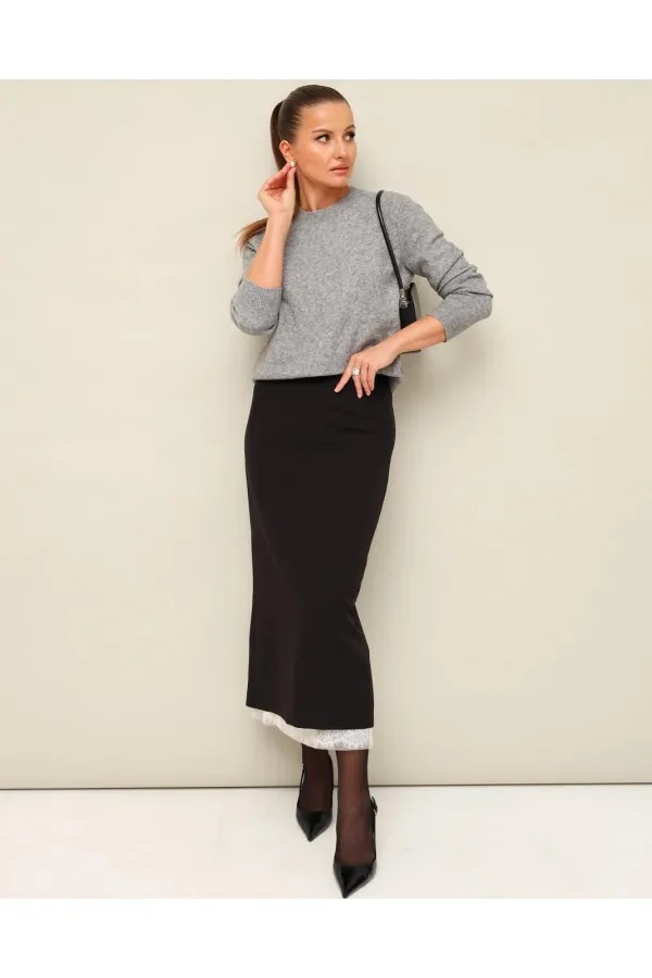 Юбка-карандаш прямого силуэта в длине миди. Верхняя юбка выполнена из костюмно-плательной ткани, пояс на обтачке, застёжка на потайную молнию в среднем шве по спинке. Нижняя юбка на резинке по поясу, низ обработан кружевной отделкой с сеткой. Для удобства движения сзади по юбкам обработаны разрезы.