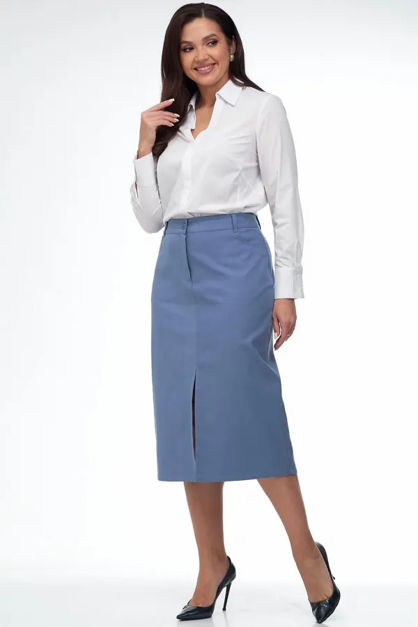 Юбка из костюмной ткани прямого силуэта без подкладки, на поясе, с застежкой на петли и пуговицы. Перед с карманами, разрезом и застежкой -«молнией». Длина 80.