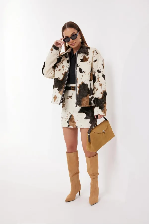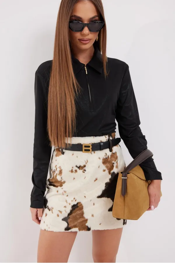 Юбка мини из ворсовой ткани. Застёжка сзади на декоративную молнию. Верх юбки на обтачке. Шлёвки спереди и сзади. Юбка на подкладке.