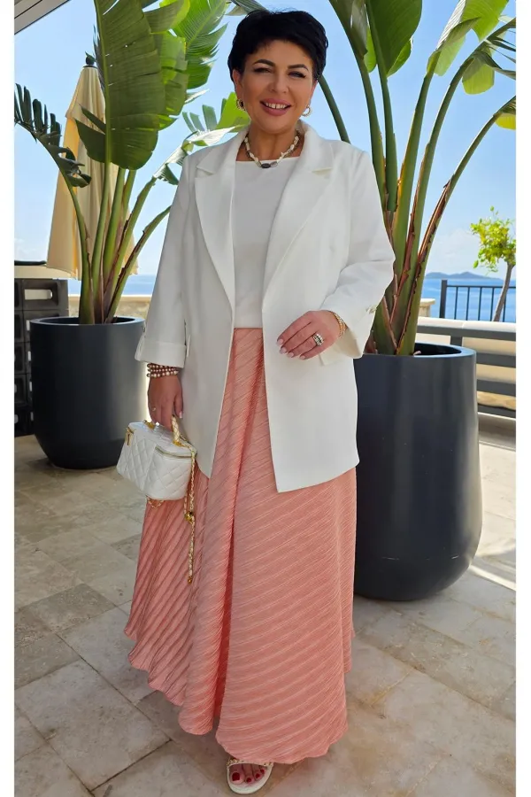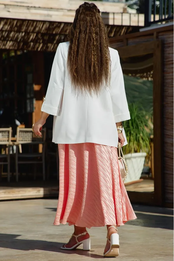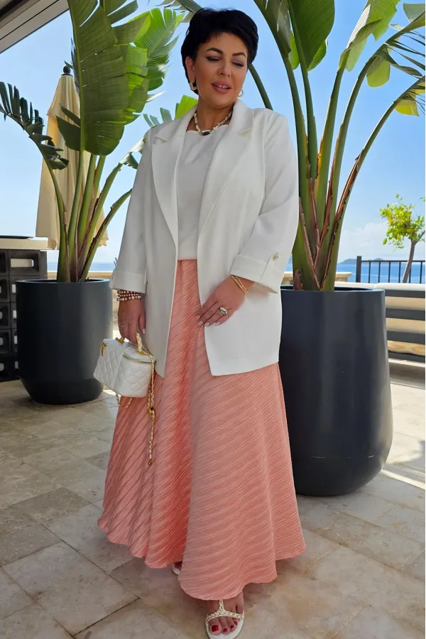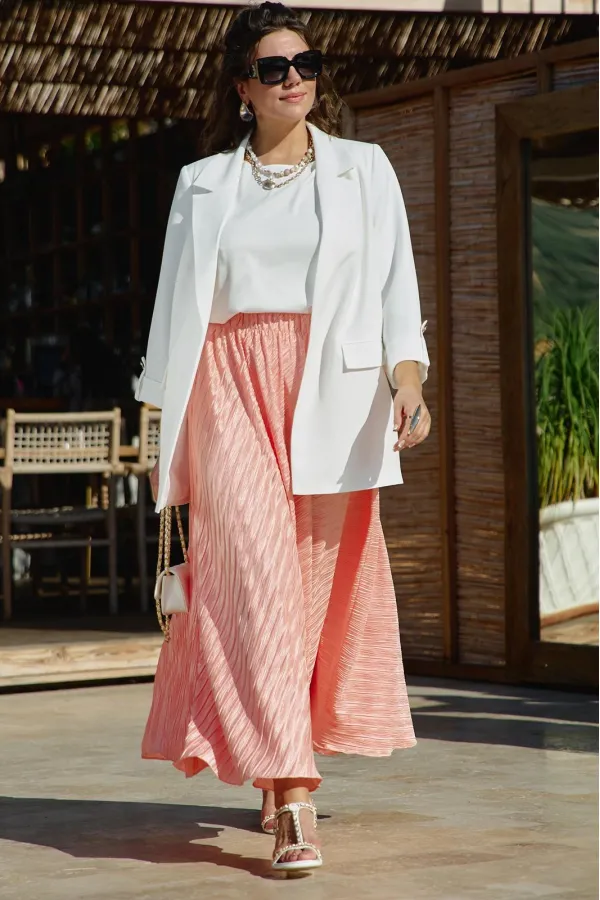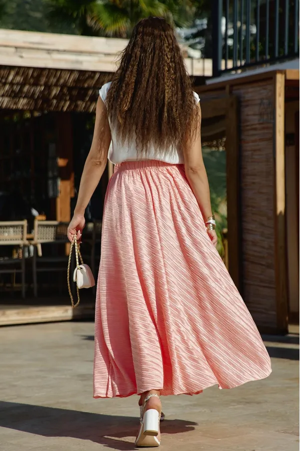 Юбка «полусолнце» в длине миди с жатой фактурой — это сочетание лёгкой драматичности и непринуждённой элегантности. Её силуэт создаёт мягкую визуальную волну, а жатая поверхность превращает каждый изгиб в игру света и тени: она одновременно утончённая и характерная, романтичная и по-городски современная. Из-за сжатой фактуры ткани юбка выглядит живой и объёмной.