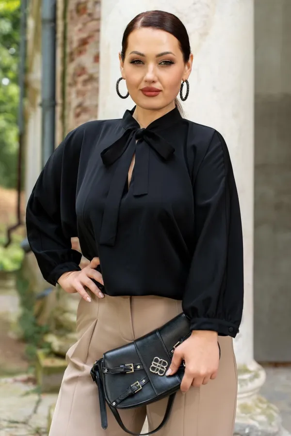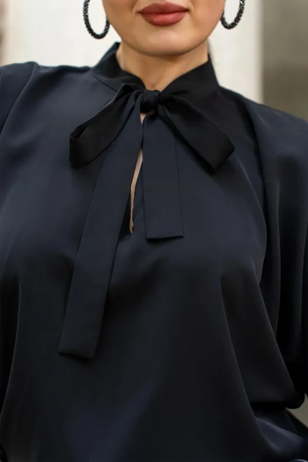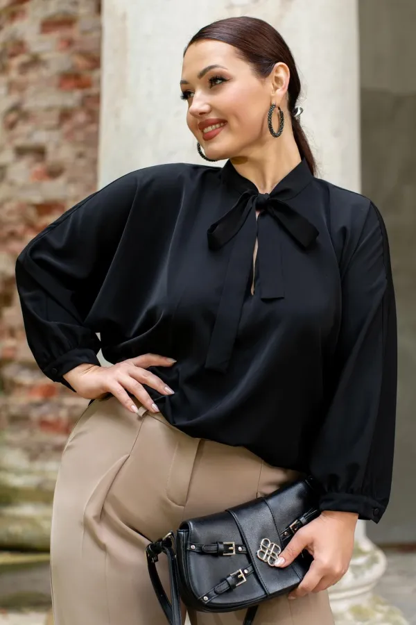 Элегантная женская блузка черного цвета, выполненная в стиле летучая мышь, идеально подойдет как для торжественного мероприятия, так и для повседневной носки. Блузка со стойкой-завязкой, добавляющими изысканности образу.... Читать далее...