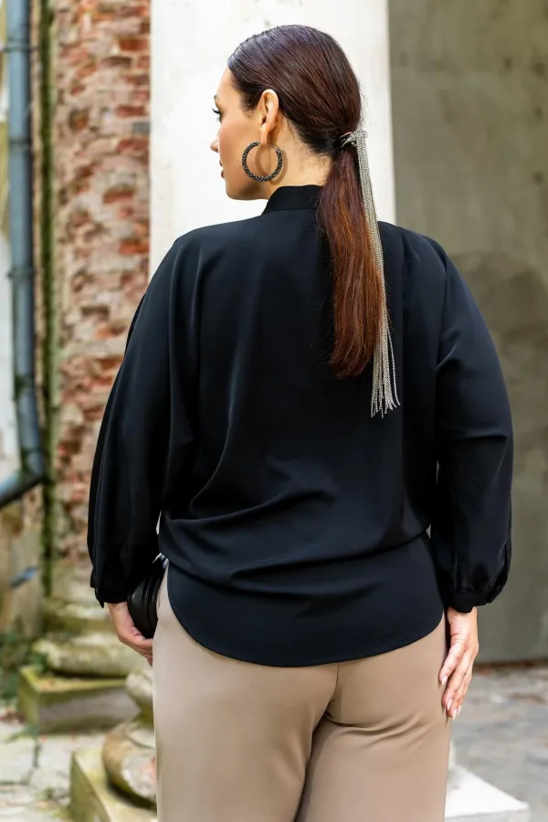 Элегантная женская блузка черного цвета, выполненная в стиле летучая мышь, идеально подойдет как для торжественного мероприятия, так и для повседневной носки. Блузка со стойкой-завязкой, добавляющими изысканности образу. Цельнокроеные рукава с застежкой на петлю и пуговицу.Асимметричный низ блузки спереди короче, сзади длиннее, что придает дополнительный стиль. Эта блузка станет изысканным дополнением к вашему гардеробу.