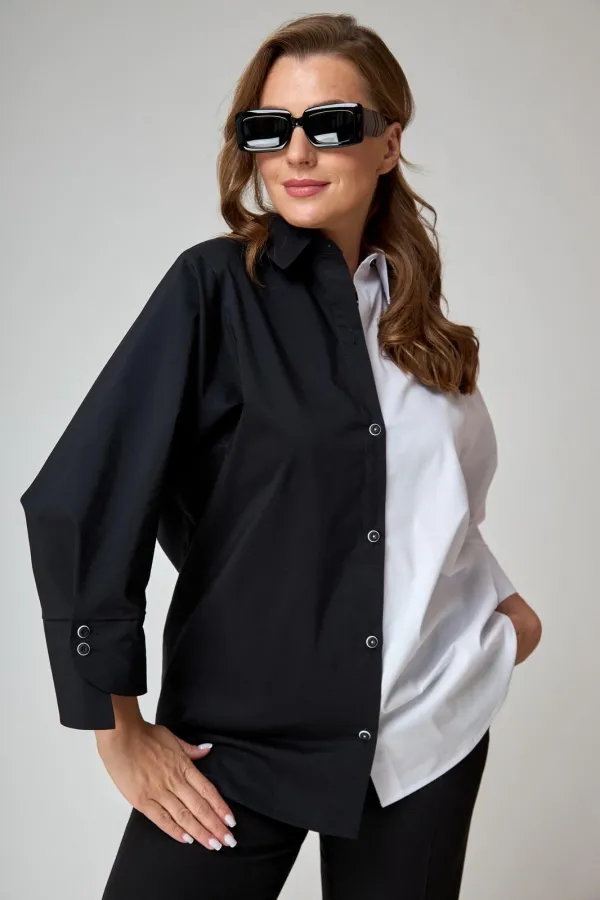 Рубашка женская свободного силуэта с застежкой спереди и сзади на петли и пуговицы на притачных планках и стояче-отложным воротником, рукава рубашечного покроя на квадратной пройме, по низу рукавов притачные манжеты фигурной формы с пуговицами. Рубашка выполнена из высококачественного смесового хлопка 2 цветов-съёмные части при стирке.