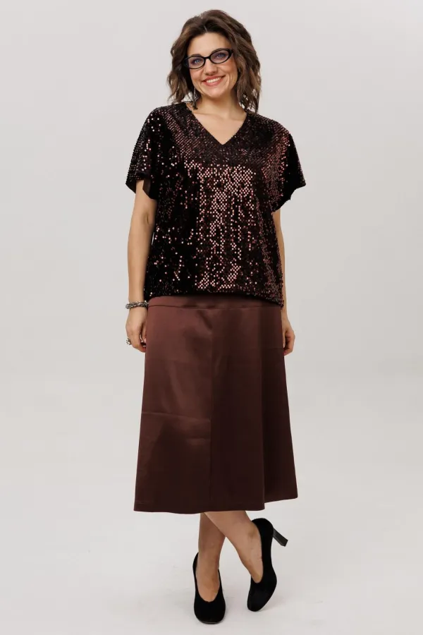 На модели в блузоне цвета «арманьяк» атласная юбка 1410, юбка-брюки 1783.Размер 48: ОГ-116; ОБ-114; ДИ от плеча до спинки - 68; ДИ от полочки до плеча - 65; ШП-32;