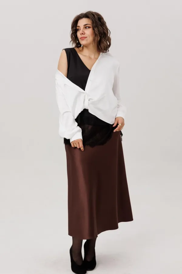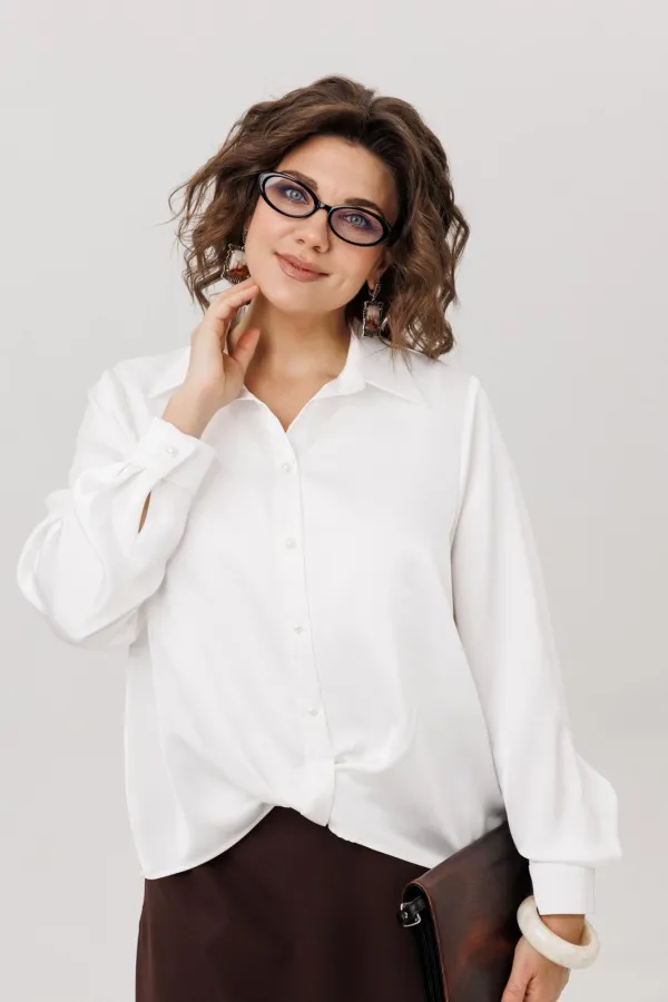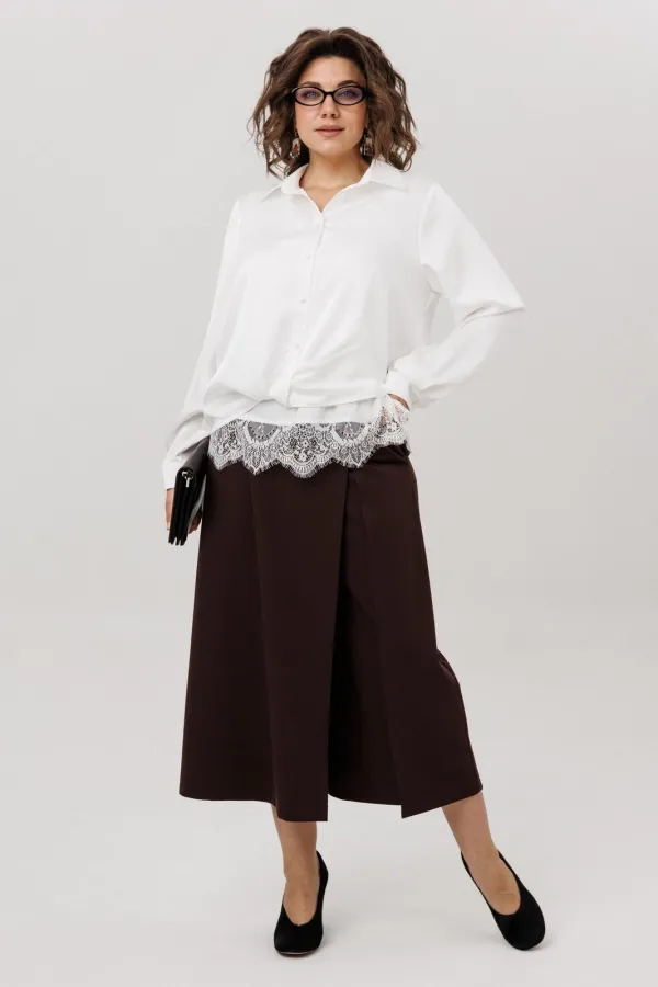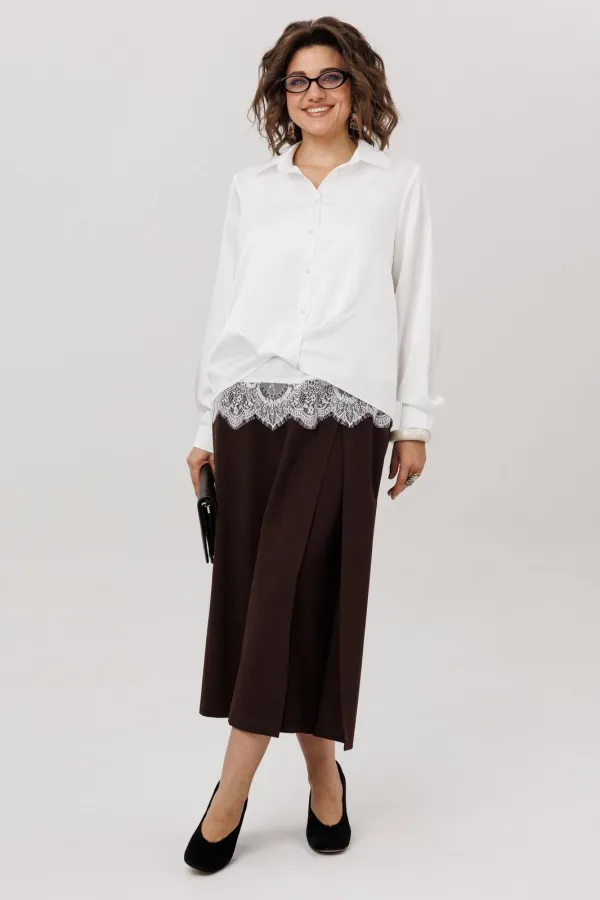 На модели в рубашке цвета «перламутровая жемчужина» топ 1664, юбка-брюки 1783 и атласная юбка 1808.Размер 52: ОГ-118; ОБ-124; ОП-42; ДИ спинки - 65; ДР-62; ДИ переда - 62;