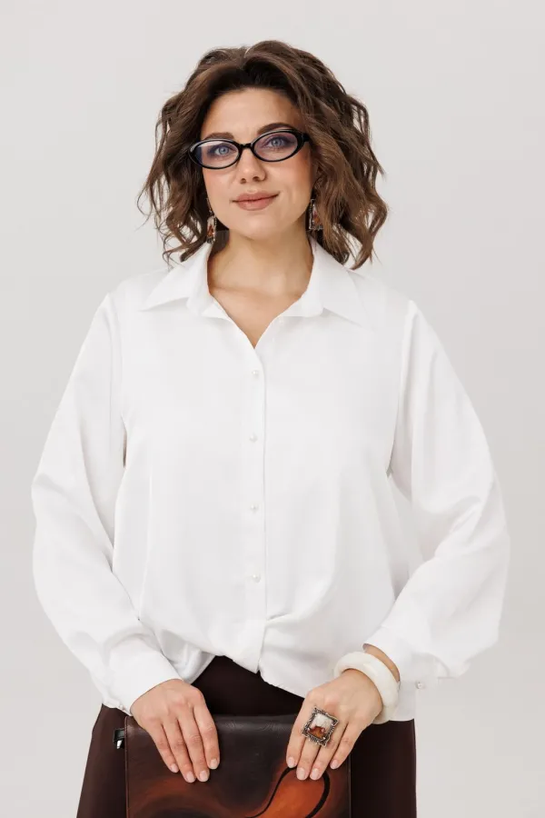 Тон задают безупречные детали: строгий отложной воротник на стойке, чёткая линия застёжки на пуговицах и идеальные втачные рукава, собранные у запястья в изящные манжеты. Их совершенство оттеняет смелая игра кроя - асимметричный низ, и та самая изысканная деталь в виде мягкого узла, которая придаёт силуэту запоминающийся художественный штрих.