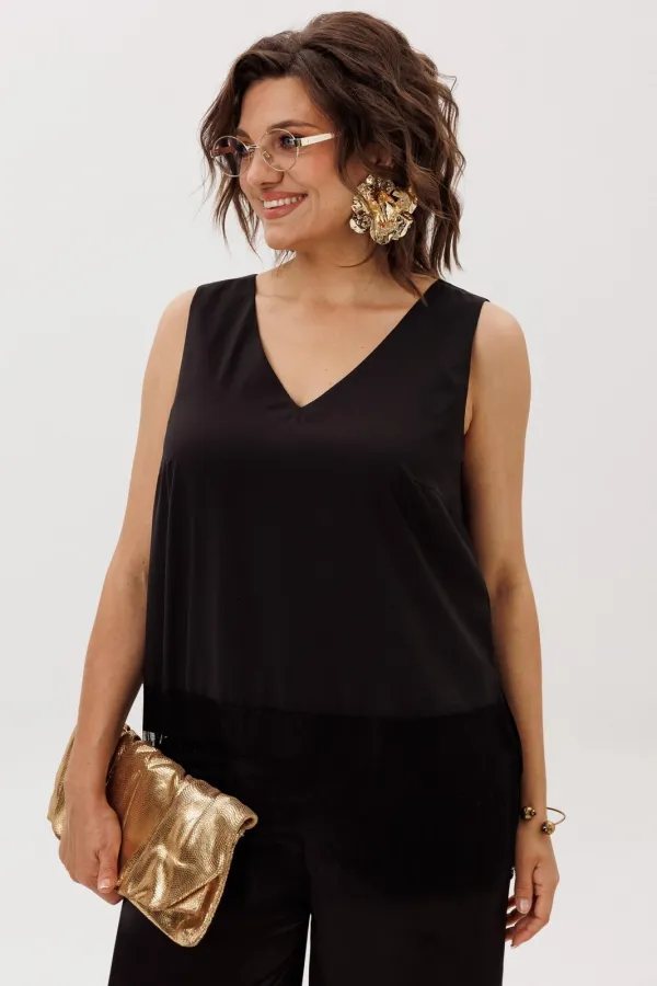 Этот топ от Анелли — искусство быть неотразимой в любой момент. Его прямой силуэт служит идеальным фоном для изысканной игры деталей. Глубокий V-образный вырез мягко обрамляет линию шеи, придавая образу элегантную чувственность, а по бокам тонкие разрезы подчеркивают свободу и грацию движений.