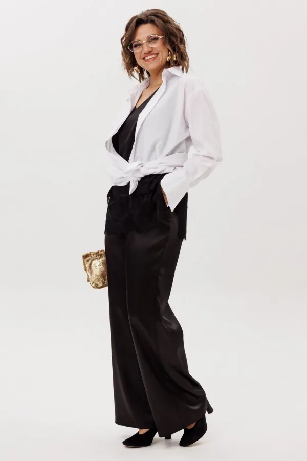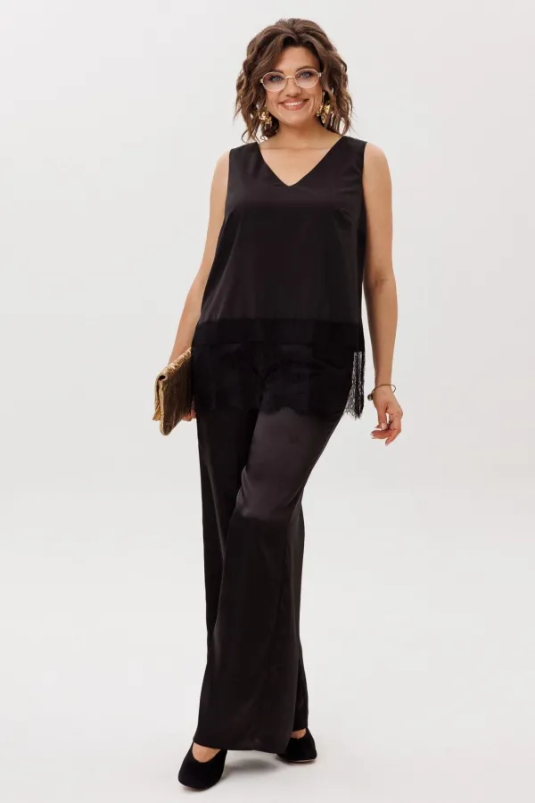 На модели в топе цвета «черный лед» атласные брюки 1737, юбка 1510, жакет 1661 и белая рубашка 1203.1.Размер 52: ОГ-112; ОБ-116; ДИ-67;