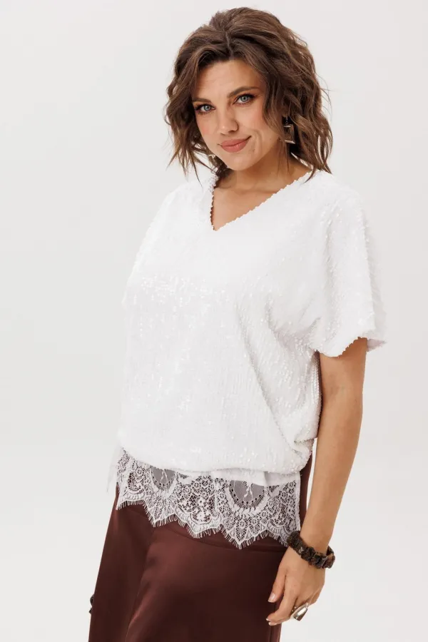 На модели в топе цвета «кристаллики льда» атласные брюки 1737, юбка 1510, блузон в пайетки 1522 и жакет 1661.Размер 52: ОГ-112; ОБ-116; ДИ-67;