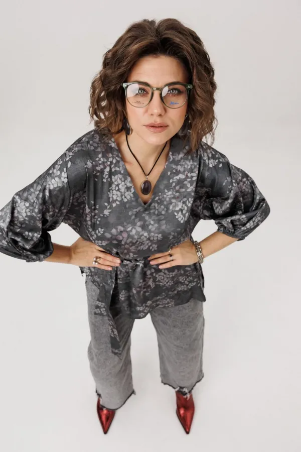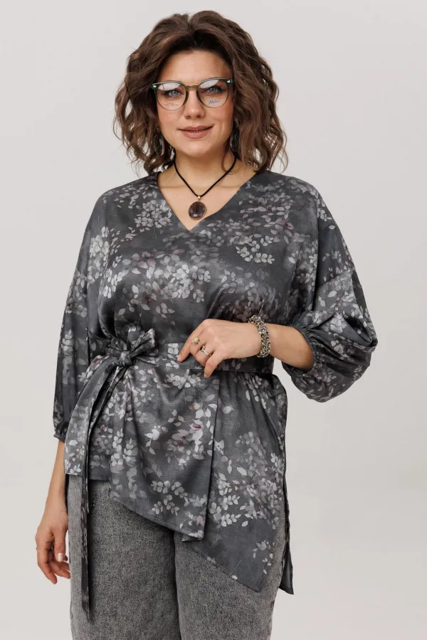 Главная особенность этой модели — продуманная многозадачность. Пояс в комплекте позволяет вам самостоятельно создавать нужный образ: затяните его, чтобы подчеркнуть талию и создать фигуру «песочные часы», или отпустите для расслабленного силуэта в стиле бохо. Завершает картину асимметричный низ с разрезом — деталь, которая делает блузу по-настоящему уникальной и визуально вытягивает силуэт.