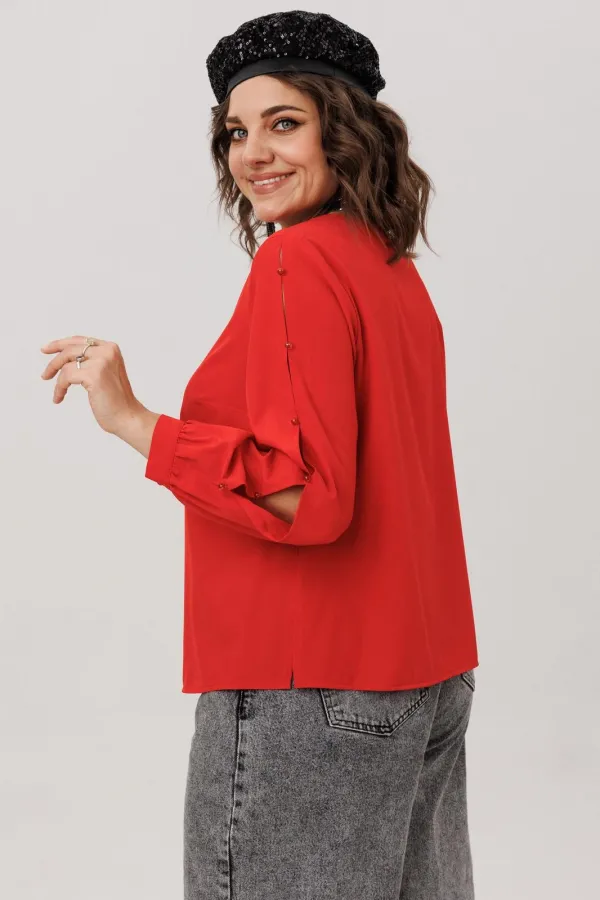Мягкая ткань драпируется полуприлегающим силуэтом, ласково обрисовывая линии фигуры. Особое внимание притягивают рукава: втачные, с элегантными разрезами по всей длине, они завершаются манжетами на пуговицах, украшенными навесными петельками - деталь, придающая образу неповторимый шарм.