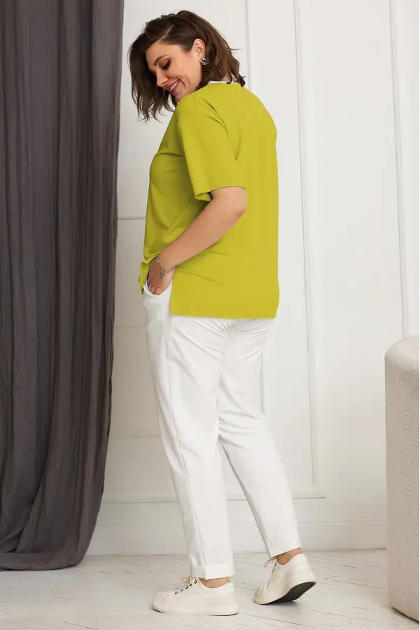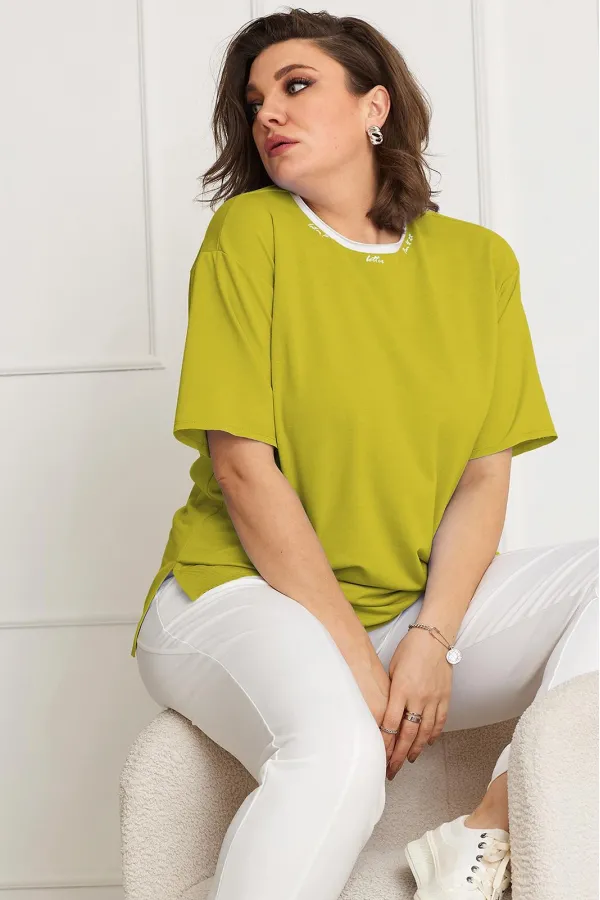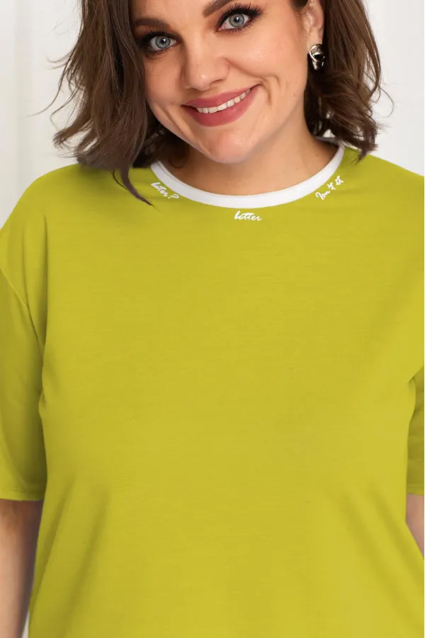 Горловина футболки полукруглой формы контрастного цвета, обработана обтачкой с открытым срезом и декорирована термо-надписями.