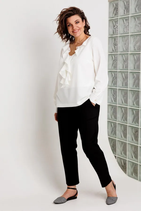 Базовая блуза свободного кроя с V-образным вырезом, который декорирован волнистой рюшей, визуально удлиняет шею и вытягивает силуэт. Рукав втачной с фигурной манжетой с функциональной пуговицей золотистого цвета.