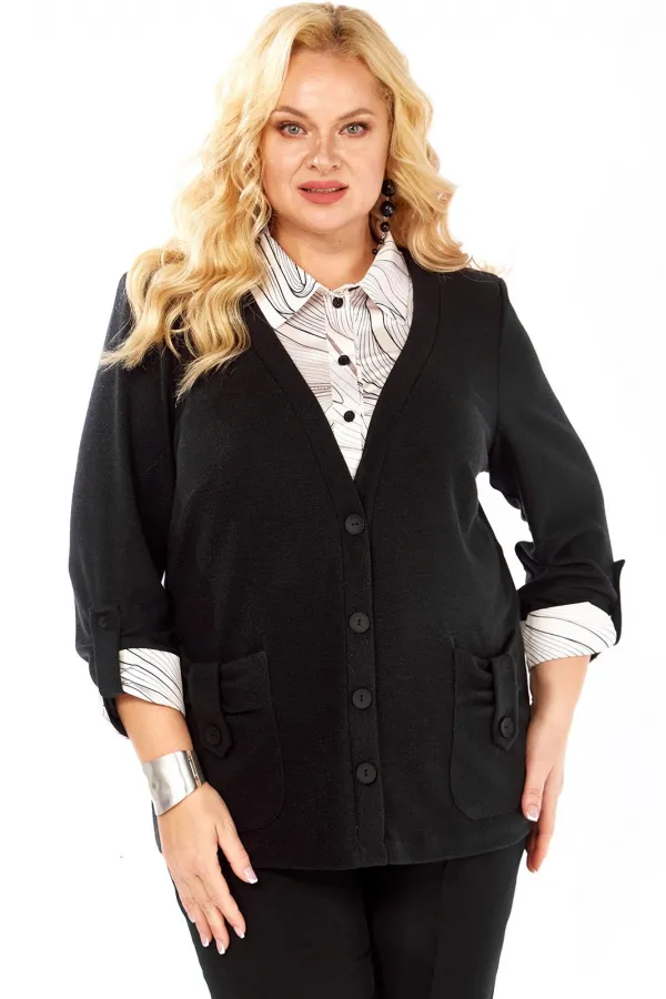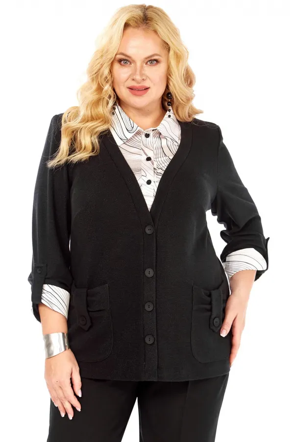 Имитация рубашки под джемпером - это отличный вариант практичной и удобной одежды. Джемпер прямого силуэта, комбинированный, выполнен из мягкого трикотажа и блузочной ткани. Полочка с нагрудными вытачками, накладными фиг... Читать далее...