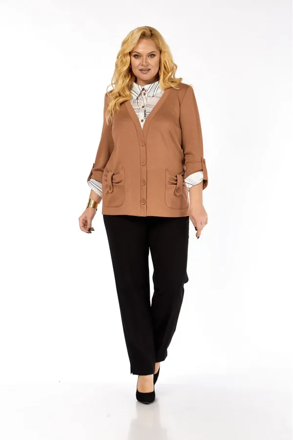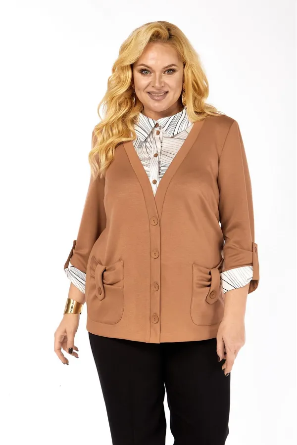 Имитация рубашки под джемпером - это отличный вариант практичной и удобной одежды. Джемпер прямого силуэта, комбинированный, выполнен из мягкого трикотажа и блузочной ткани. Полочка с нагрудными вытачками, накладными фиг... Читать далее...