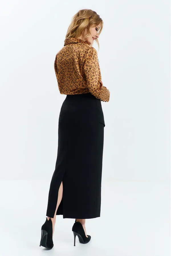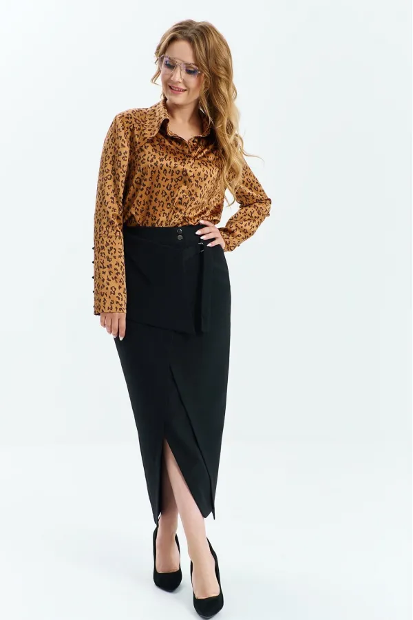 блуза женская выполнена из гладкой струящейся ткани с сатиновым блеском. Горловина отложной воротник на стойке, рукав втачной длинный, по низу рукава расположена высокая манжета с застёжкой петли пуговицы. По переду изделия расположена потайная планка с застёжкой петли пуговицы, по спинке изделия расположены таллиевые выточки.Модель подходит на рост 164-170.