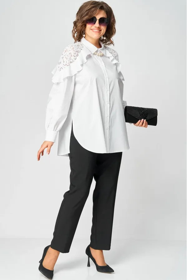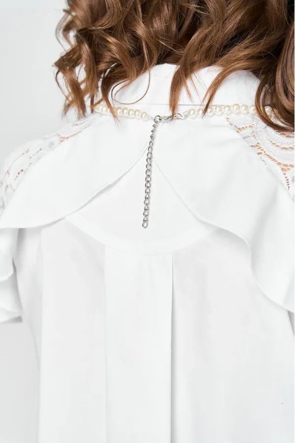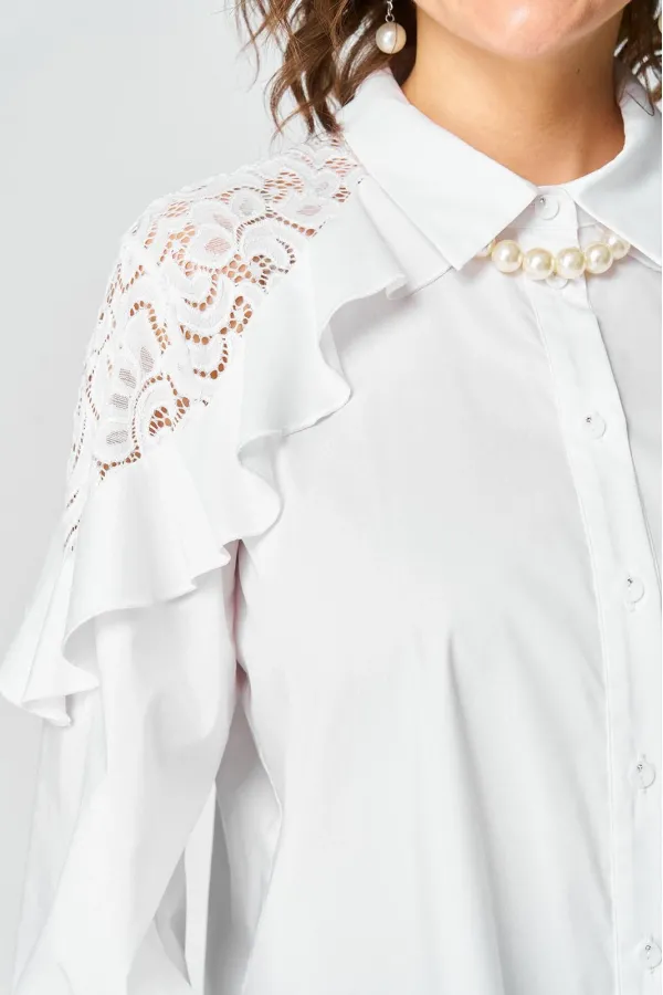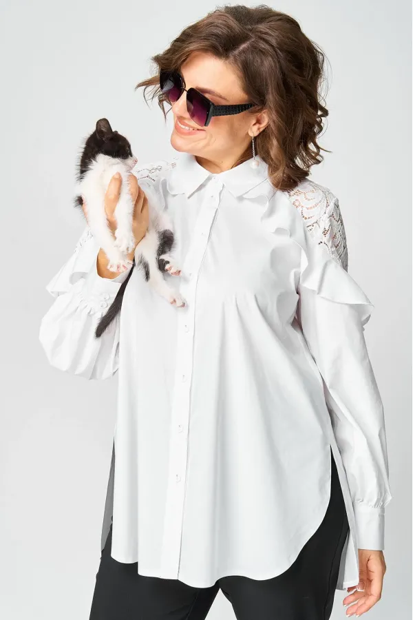 Блузка женская шикарная красивая нарядно-повседневная свободного силуэта выполнена их хлопка в сочетании с элегантным кружевом. Вырез горловины воротник на стойке рубашечного типа, рукав втачной с декоративным подрезом из кружева по низу на притачной манжете. Застежка до верху на обметанные петли и пуговицы. Низ блузы фигурный, в боковых швах обработан разрезы.