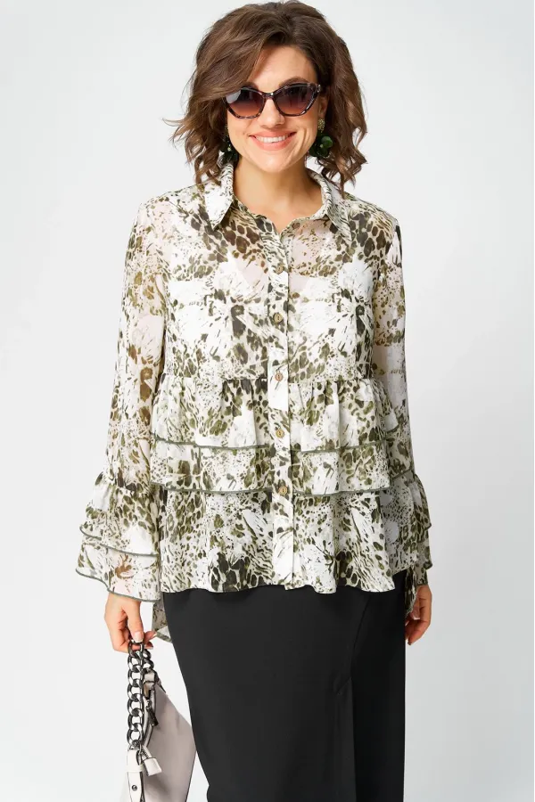 Блуза женская шикарная нарядно - повседневная полуприлегающего силуэта на подкладке, выполнена из красивого шифона с принтом. Вырез горловины воротник на стойке рубашечного типа, рукав втачной по низу с притачными воланами. Застежка доверху на обметанные петли и пуговицы, низ блузы фигурный (по спинке длиннее). По переду блузы притачные воланы, в боковых швах обработаны разрезы. Декором блузы служит принт самой ткани и отделочные элементы в виде воланов.
