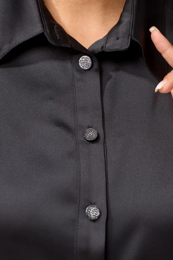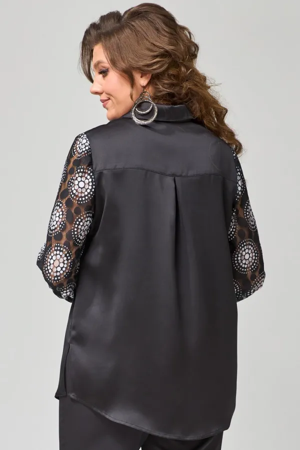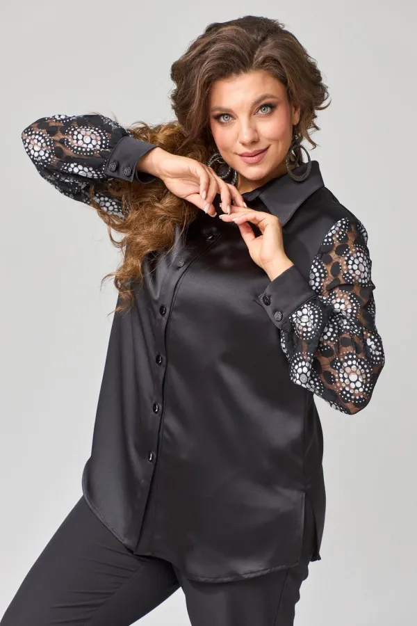 Блузка нарядная Ягла прямого силуэта, на застежку петли - пуговицы. По груди вытачка, по спинке отрезная кокетка и складка бантовая. Воротник отложной на стойке, рубашечного типа. По низу рукава манжет на застежку, низ рукава обработан манжетой на застежку на две пуговицы. По бокам разрезы, низ блузки обработан швом в подгибку. Внимание! Украшение в комплект не входит.