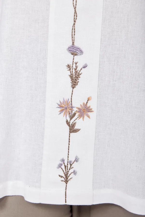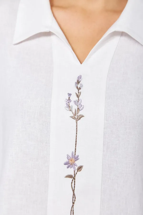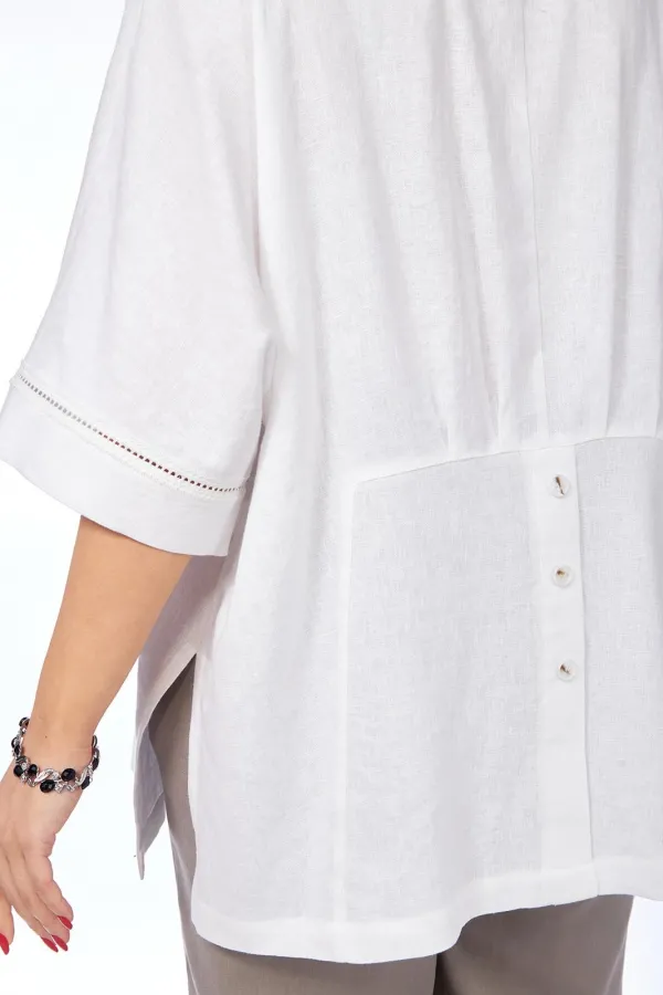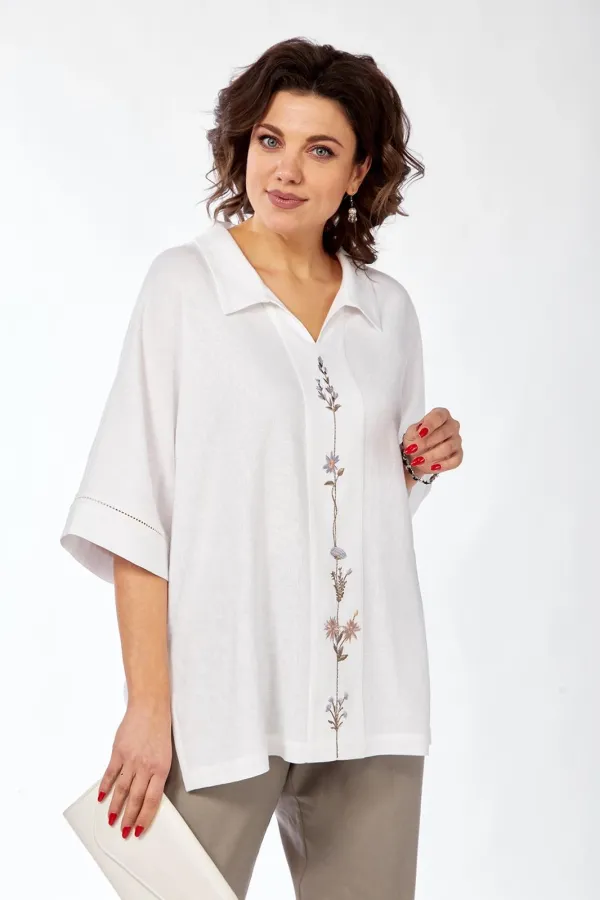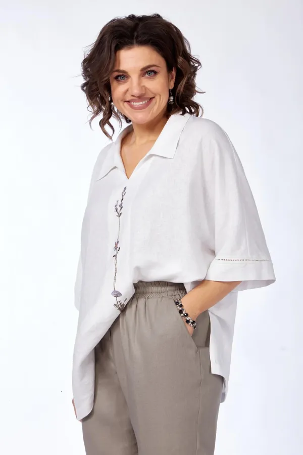 Блузка женская, свободного силуэта, выполнена из белорусского льна. Горловина V-образной формы с отложным воротником. По переду вставка с дизайнерской вышивкой. По спинке обработан средний шов и декоративная вставка со складками и пуговицами. Рукава цельнокроенные, декорированные кружевной тесьмой. В боковых швах обработаны разрезы.