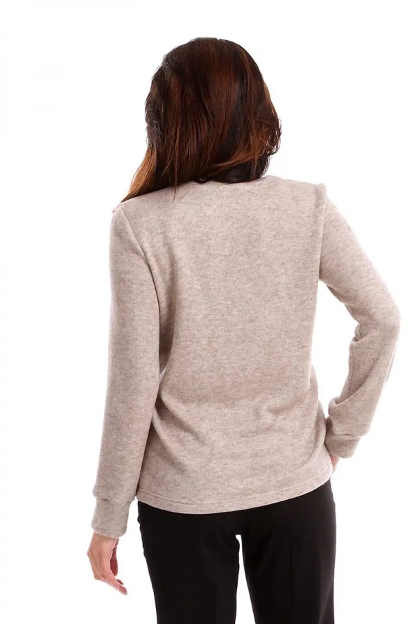 Блуза прямого покроя выполнена из мягкого трикотажного полотна, рукав втачной одношовный, заканчивается манжетой.Воротник стойка, блуза без застежки.Длина спинки по центру 65 см.Изделие не дает усадку, малосминаемое, не вытягивается.