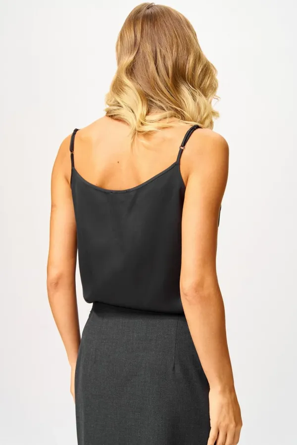 Топ на регулируемых бретелях, длиной выше линии бедер. Перед с нагрудными вытачками, в боковых швах разрезы.