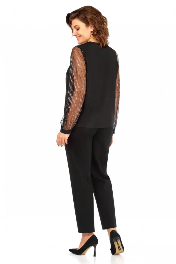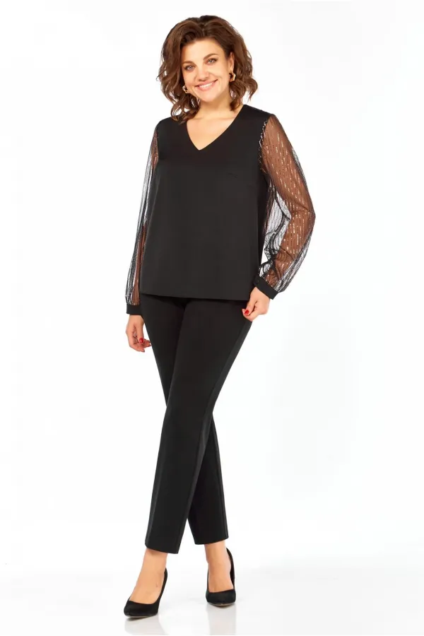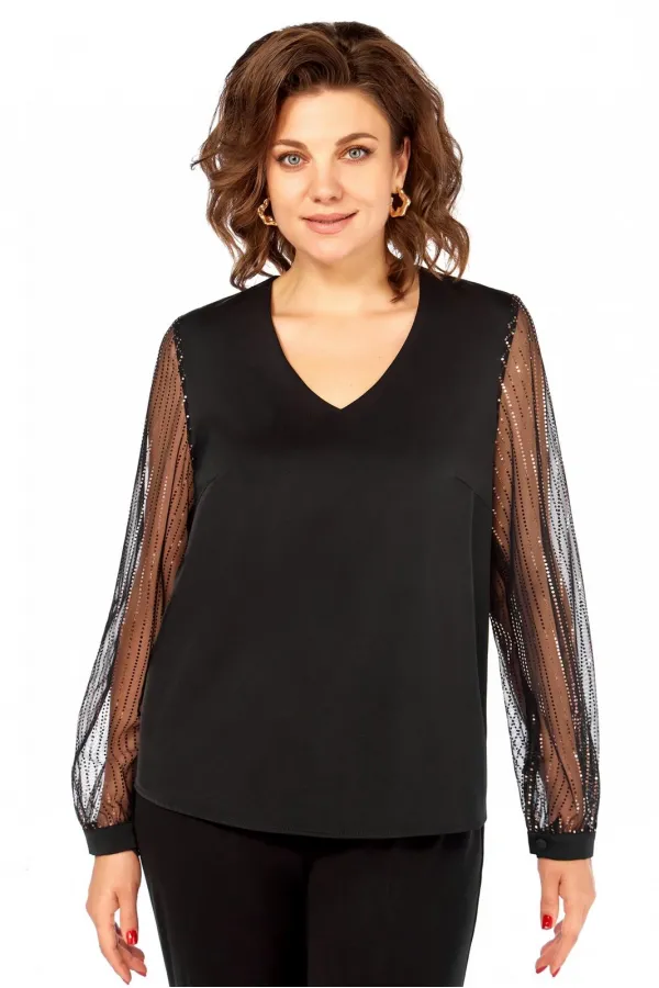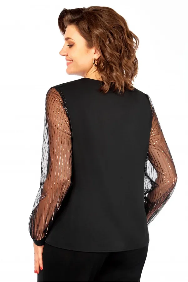 Блузка нарядная выполнена из пластичной шелковистой ткани с легким атласным блеском, рукава – из прозрачной сетки с пайетками. Блуза прямого силуэта с нагрудными вытачками, вырез горловины углубленный, рукав длинный, притачная манжета с пуговицей.