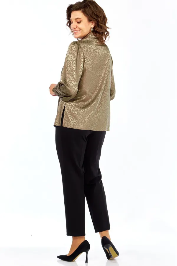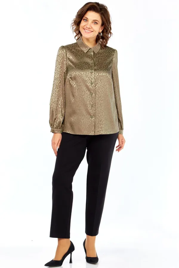 Блузка прямого силуэта, выполнена из ткани типа тонкого атласа с жаккардовым рисунком. Воротник на стойке, застежка на пуговицы, по боковым швам разрезы. Рукав длинный, расширенный, сверху небольшая сборка, внизу тоже сборка + притачная манжета с пуговицей.