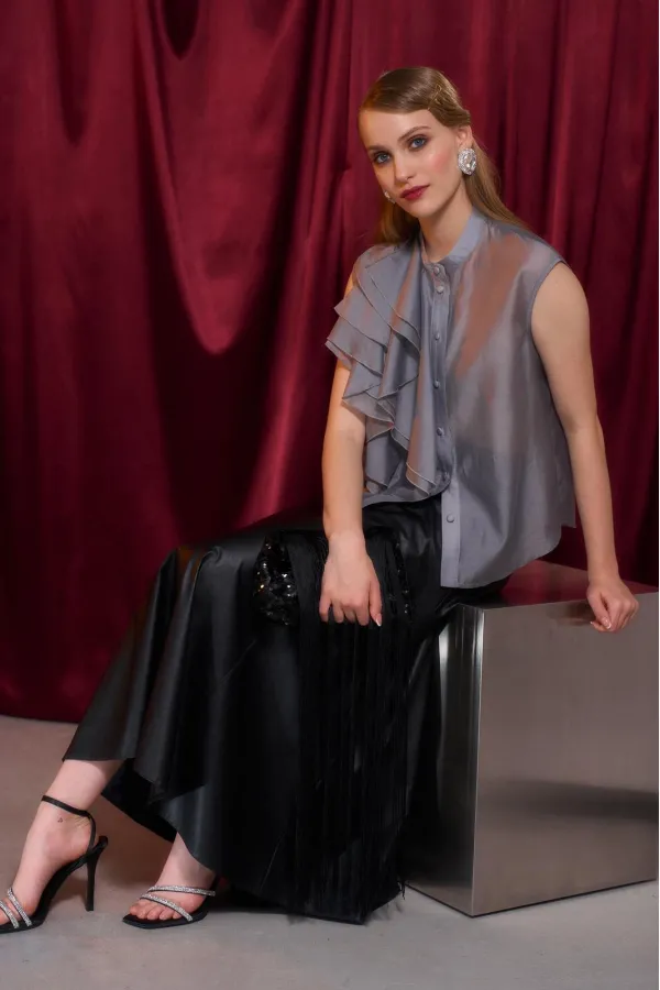 Блуза прямого силуэта, по горловине воротник-стойка. Центральная застежка на петли и пуговицы. На левой стороне блузы настрочные воланы.Блуза:
