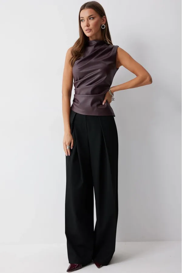 Блуза прилегающего силуэта из экокожи с ассиметричным низом. Горловина с цельнокроеной стойкой. По переду декоративные складки, выходящие из плеча и бокового шва. На спинке в центральном шве потайная молния и талиевые вытачки.