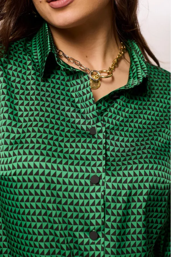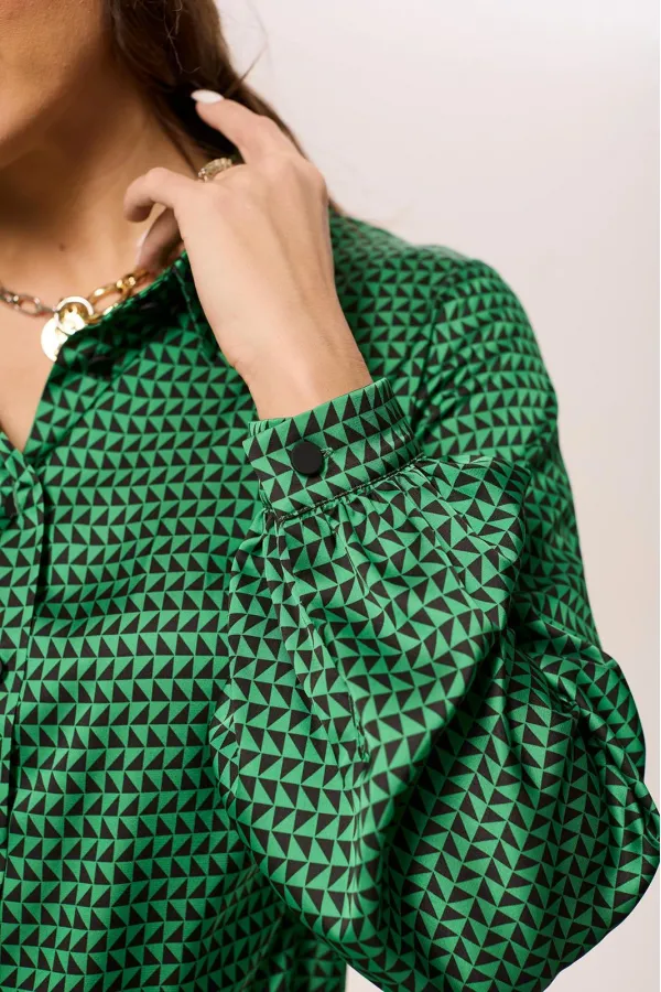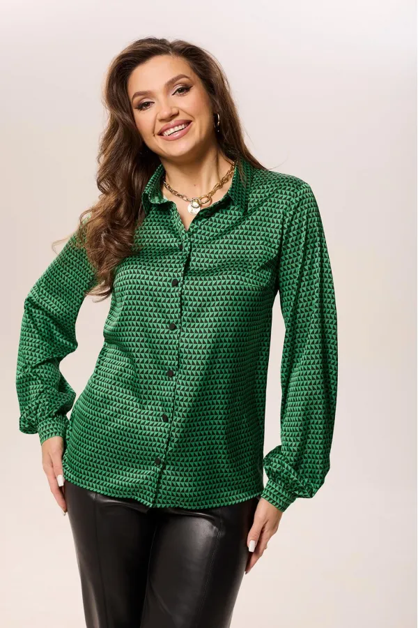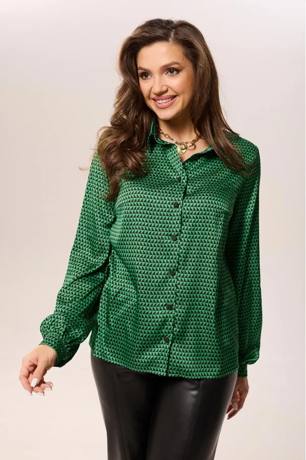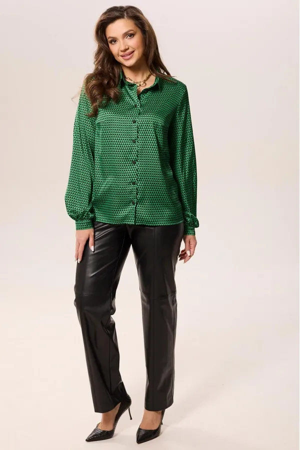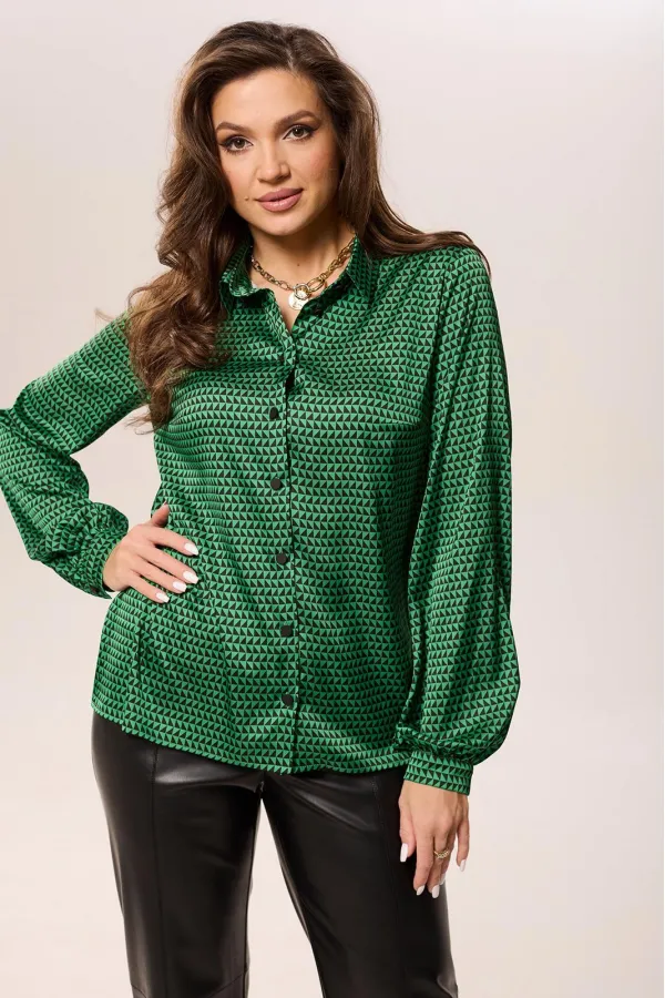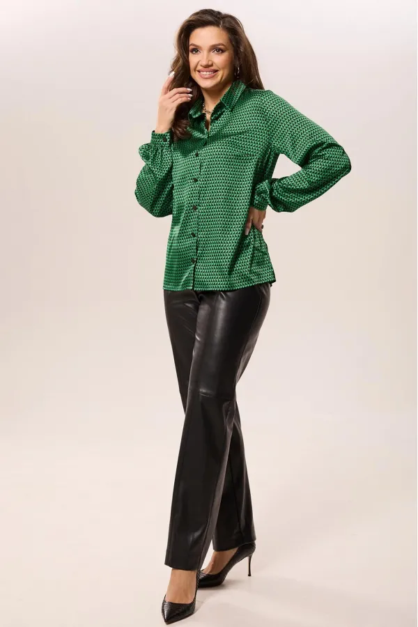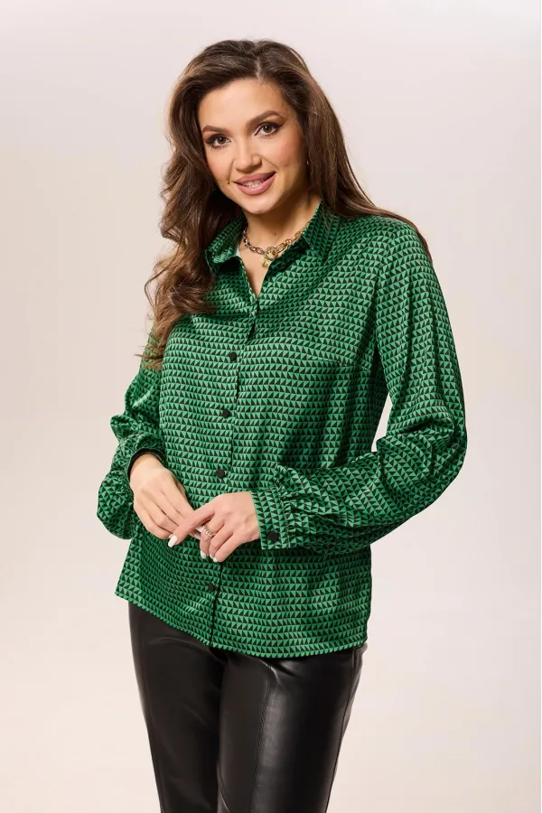 Блузка женская прямого силуэта на центральной застежке на петли и пуговицы. Перед с нагрудными вытачками от боковых швов. Спинка цельнокроеная. Рукав втачной одношовный длинный по низу со сборкой и на манжете, застегивающемся на петлю и пуговицу. Горловина на стойке с воротником.