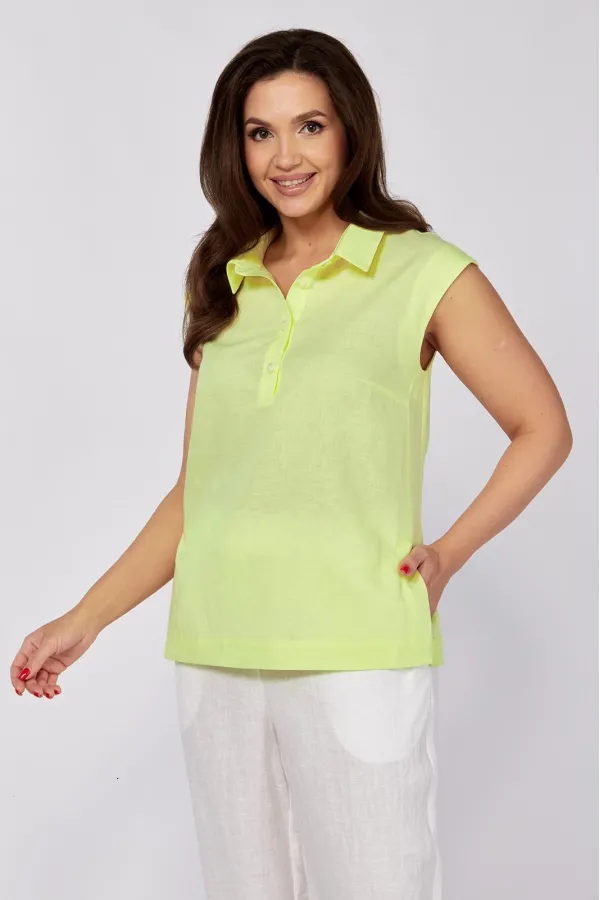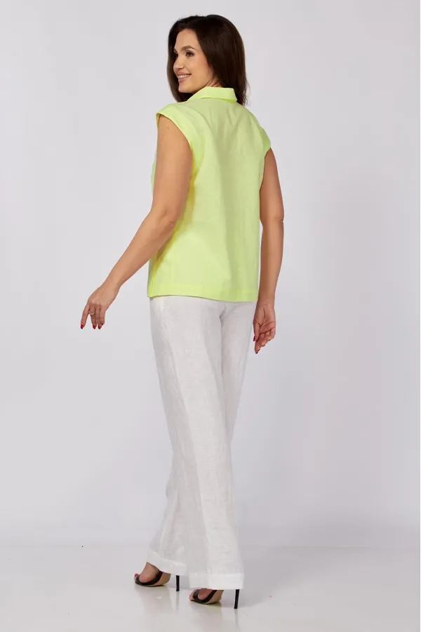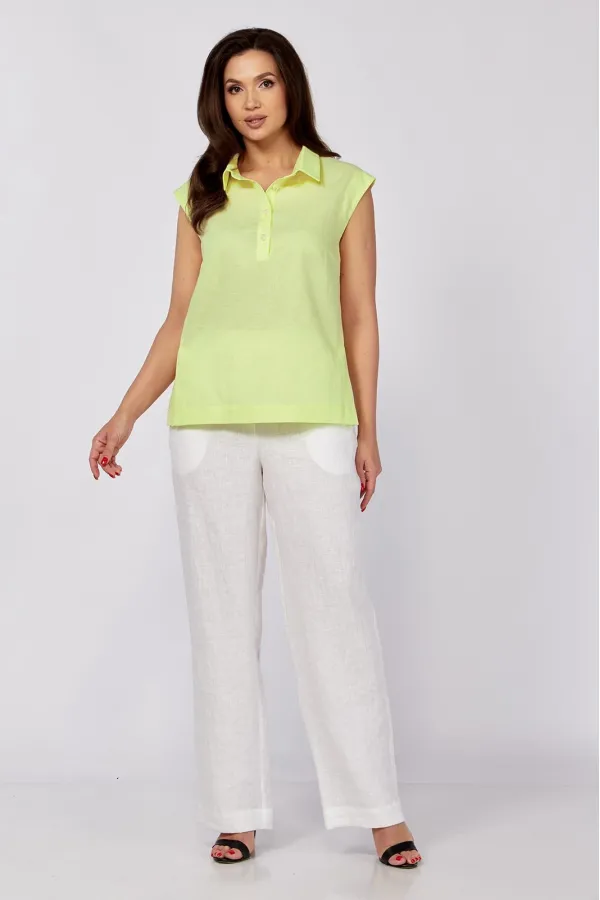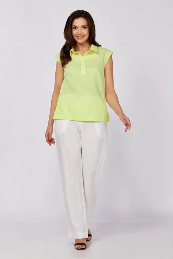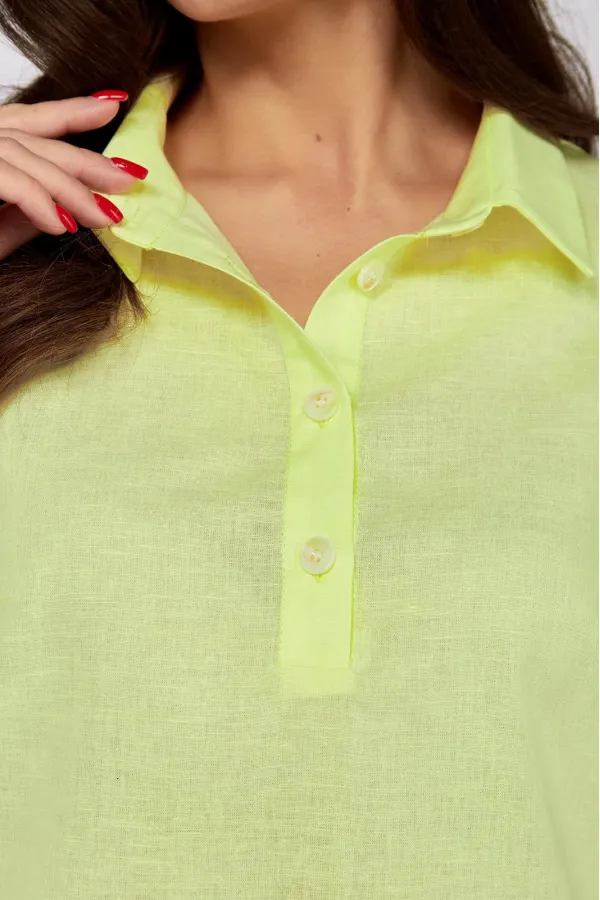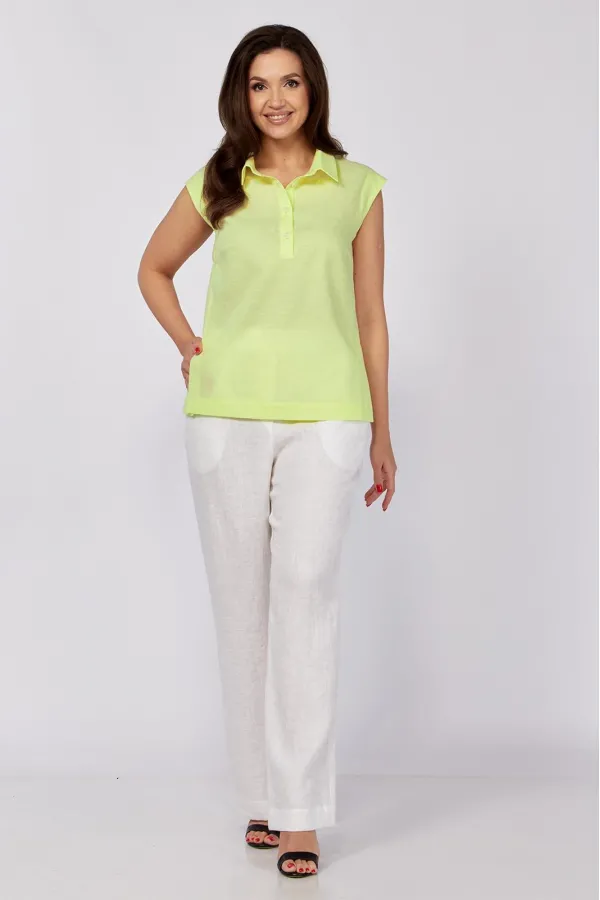 Блуза полуприлегающего силуэта, плечо слегка спущено. В боковой части переда шлицы по низу, застегивающиеся на 4 пуговицы, воротник отложной со стойкой.