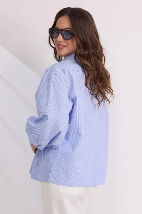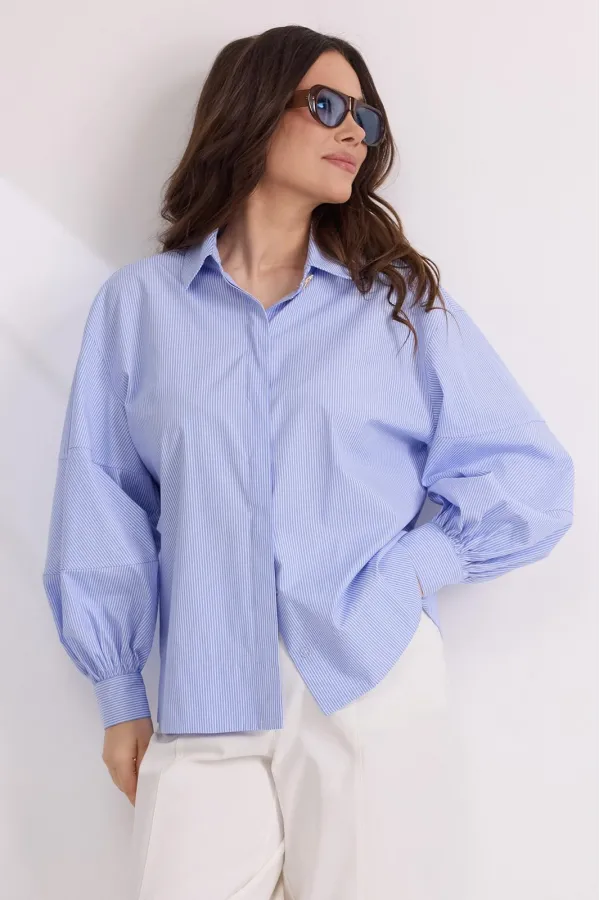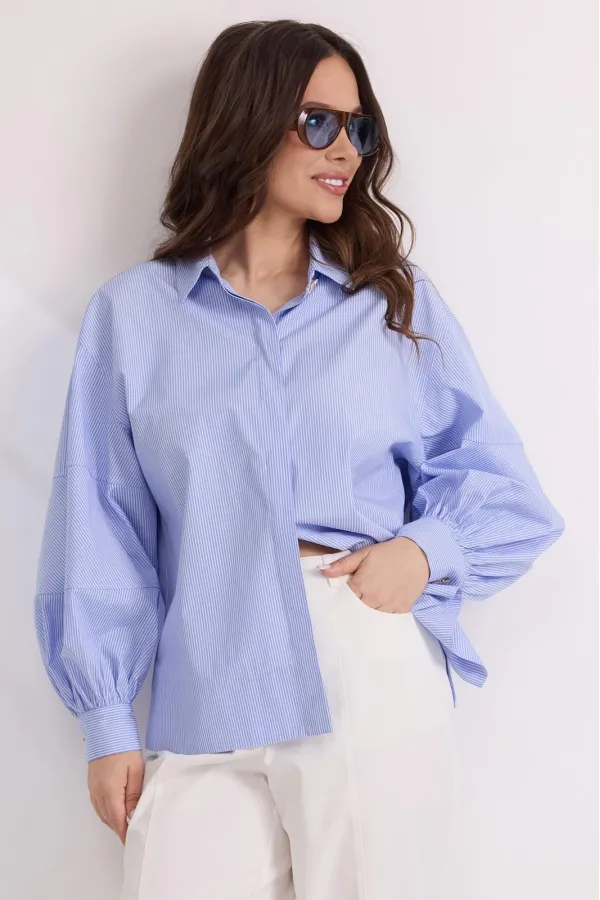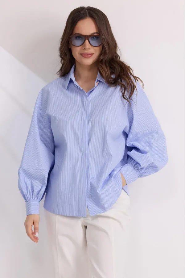 Стильная блуза свободного кроя с центральной застежкой на пришивные пуговицы, скрытые планкой из основной ткани. Воротник отложной. Уникальность блузе придает пышный рукав, дополненный притачной манжетой с застежкой на красивую пуговичку в форме банта.