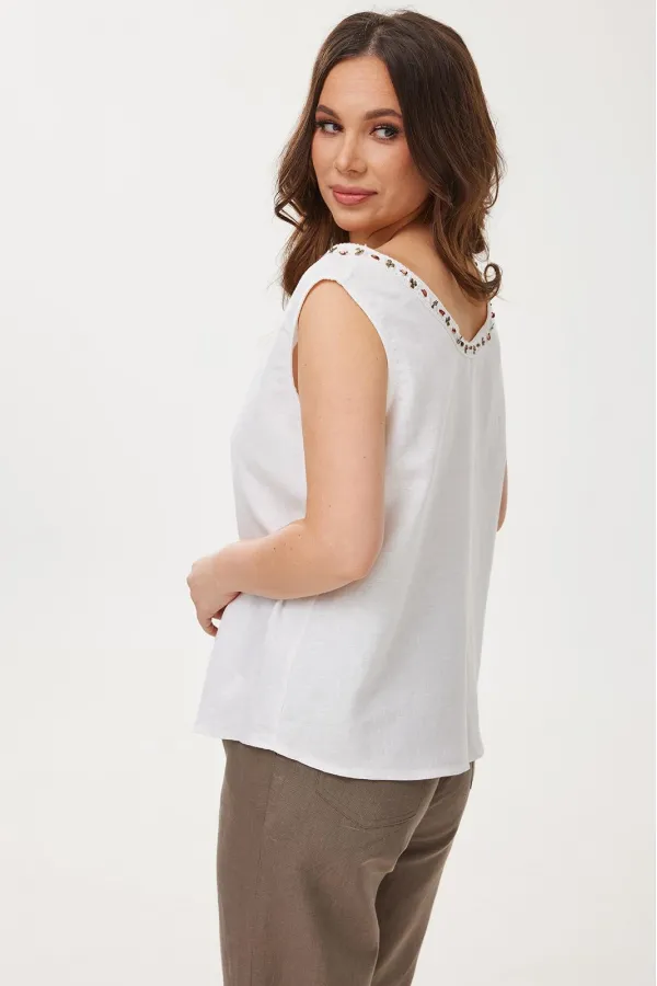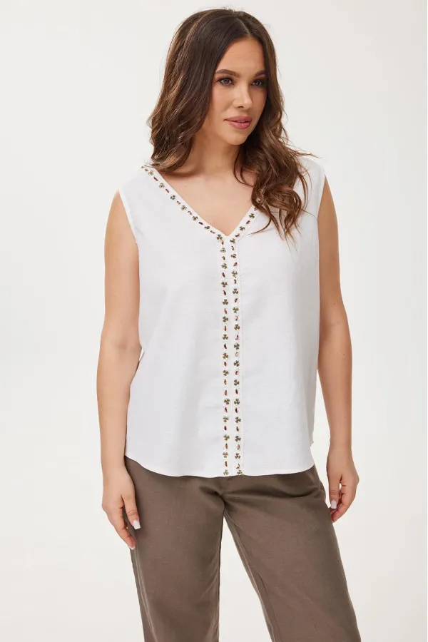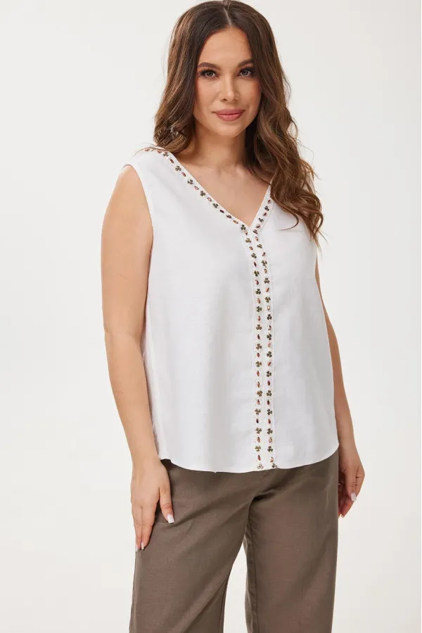Эффектная Блузка изготовлена из качественного натурального мягкого льна с эффектом мятости свободного силуэта. По переду и горловине проходит отделка -тесьма из хлопка. Низ асимметричен.