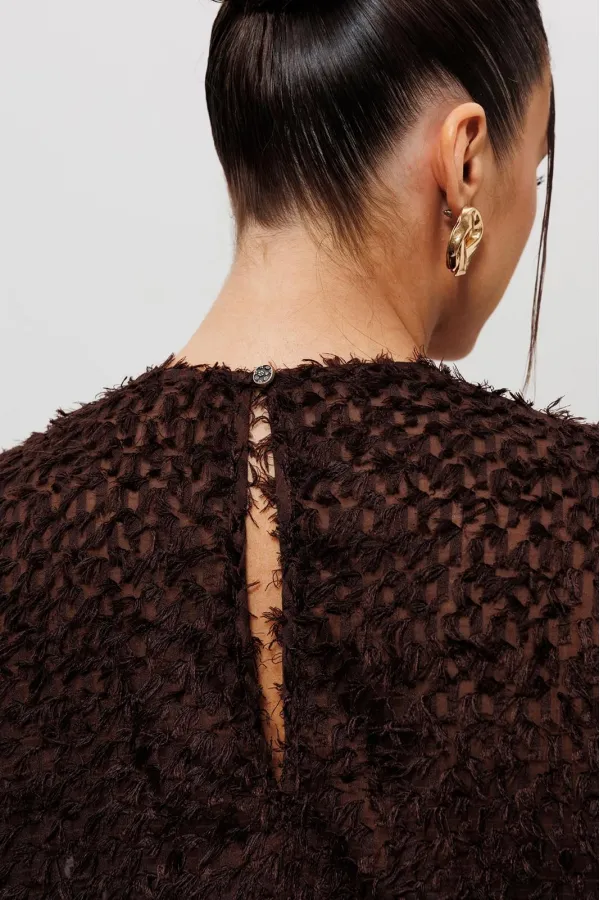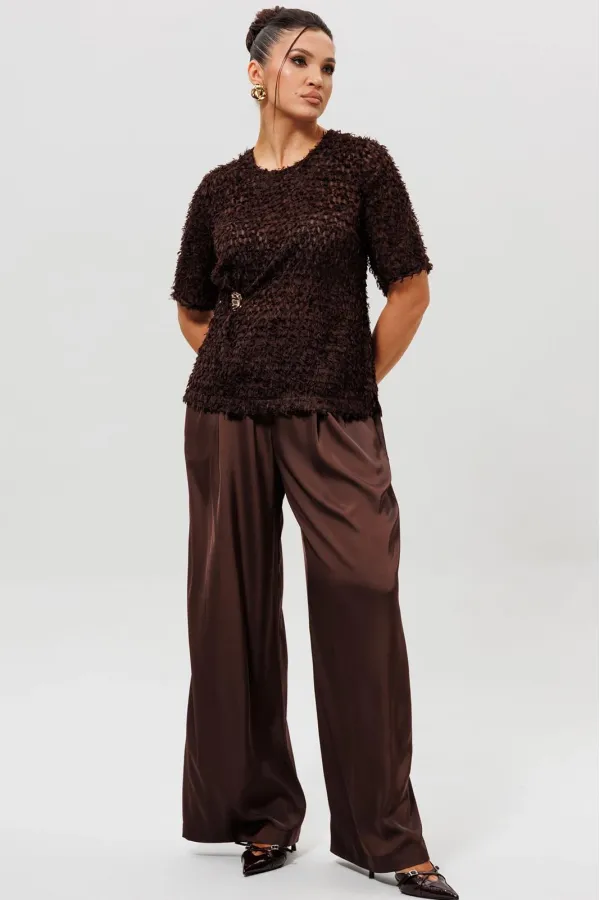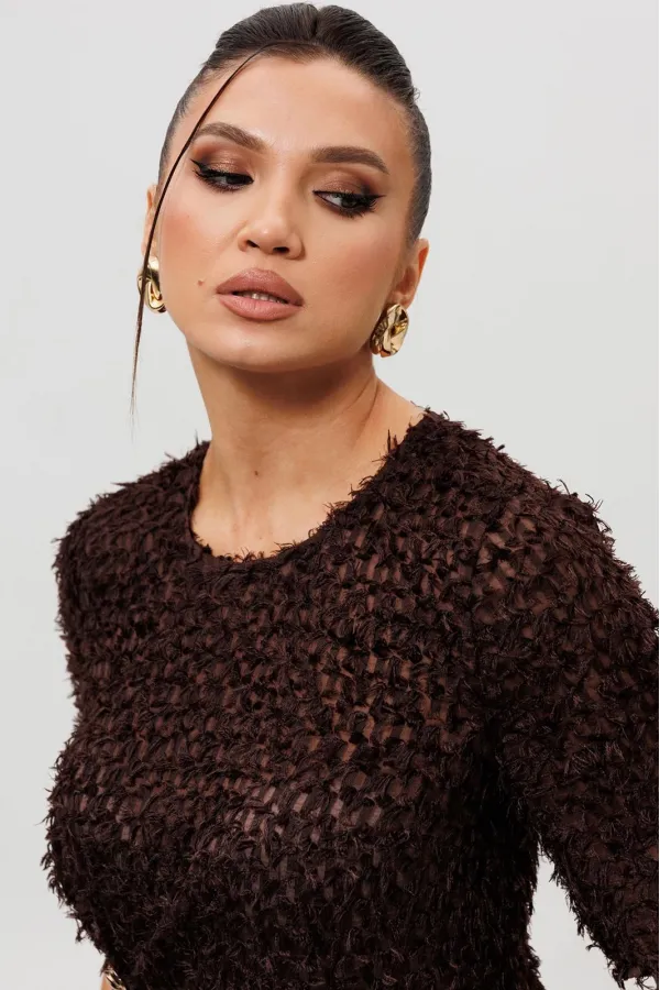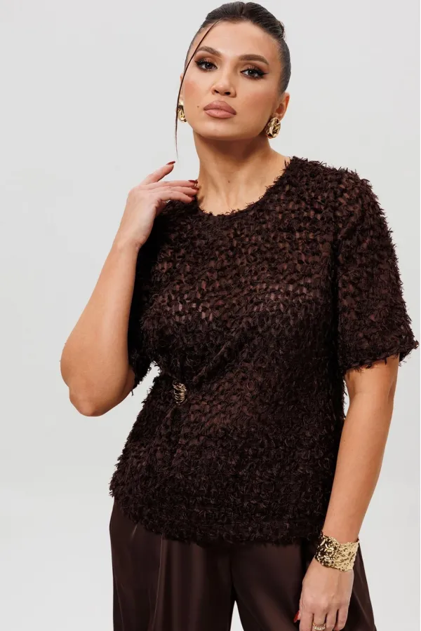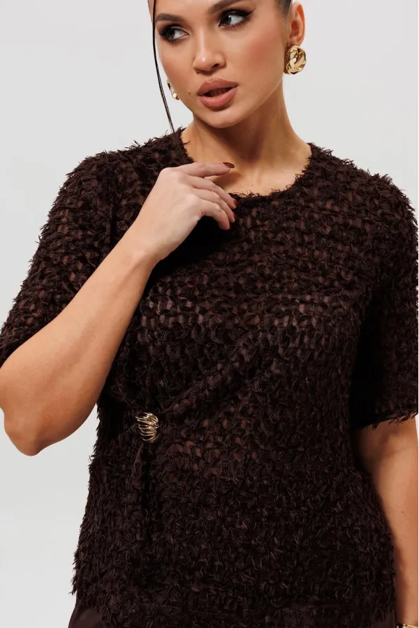 Блуза представлена в трендовом шоколадном оттенке, выполнена из лёгкой ткани травка на шифоновой основе, прямого силуэта. Перед с нагрудными вытачками и декоративным элементом: небольшие складки, которые фиксируются пришивным декоративным элементом. На спинке обработана застёжка на петлю и пуговицу. Рукав втачной. Эта коричневая блузка из ткани-травка — образец уникального дизайна и внимания к деталям. Модель с коротким рукавом украшена изящной золотой пришивной брошью и изысканной сборкой на боку, создающей мягкий объем. Особенность фасона — элегантная застежка-капелька на пуговице на спинке, которая добавляет образу индивидуальности. Блузка выполнена из фактурной ткани, которая выглядит дорого и современно. Идеальный выбор для офиса, деловой встречи или романтического ужина, чтобы подчеркнуть ваш безупречный вкус.