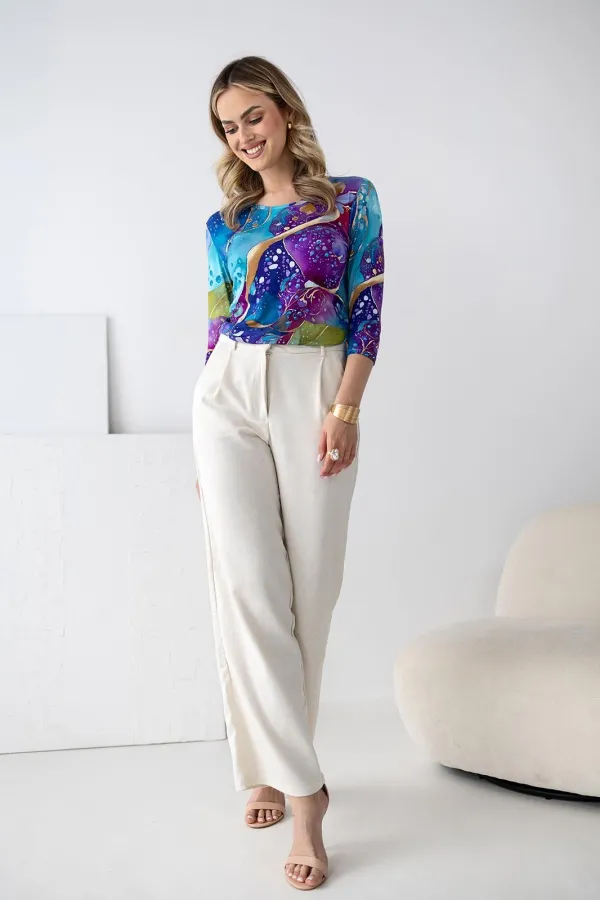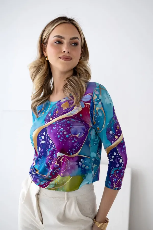 Футболка женская под джинсы повседневная из вискозы с эластаном от Nikapl из Польши. Лонгслив прямого силуэта с круглым вырезом горловины. Визуально удленяет шею. Рукава втачные, 3/4. Ткань вискоза с эластаном. Практичная. Яркие дизайны. Хороший пошив и посадка. Блузка из Польши сделана из приятной ткани и не принесёт дискомфорт в ее ношении. Качество пошива позволяет стирать ее в стиральной машине без усадки и расхождения швов. Блузки и рубашки женские это универсальные вещи, отлично подходящие для офиса, для праздника, для прогулки и на каждый день. Футболка женская большого размера будет прекрасно смотреться в комплекте с брюками классическими, джинсами большого размера и с юбкой, каждый раз помогая Вам создавать новый неповторимый образ. Практичная ткань, современный стиль, интересный дизайн, свободный покрой, широкий размерный ряд. Блузки и юбки бренда Nikapl из Польши.