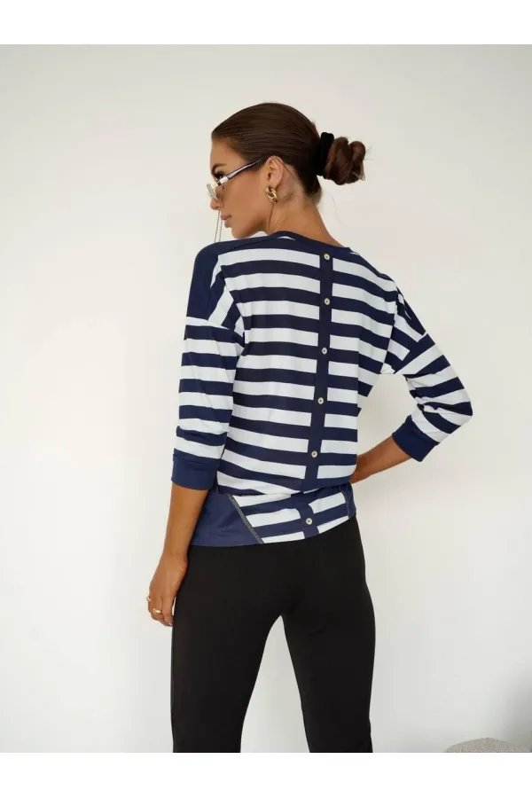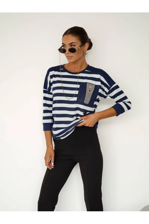 Обратите внимание на таблицу замеров! Блузка женская повседневная выполнена из мягкого польского трикотажа с добавлением вискозы, что делает ее не только стильной, но и комфортной в носке. Прямой силуэт блузки подчеркнет достоинства вашей фигуры. На груди блузка украшена потрясающим сеткой-карманом с люверсами, что придает ей особый шарм. Круглый вырез горловины делает модель универсальной и подходящей для любого случая. Спина в полоску, с декоративными пуговицами на планке по середине спинки, что создает элегантный и захватывающий вид.