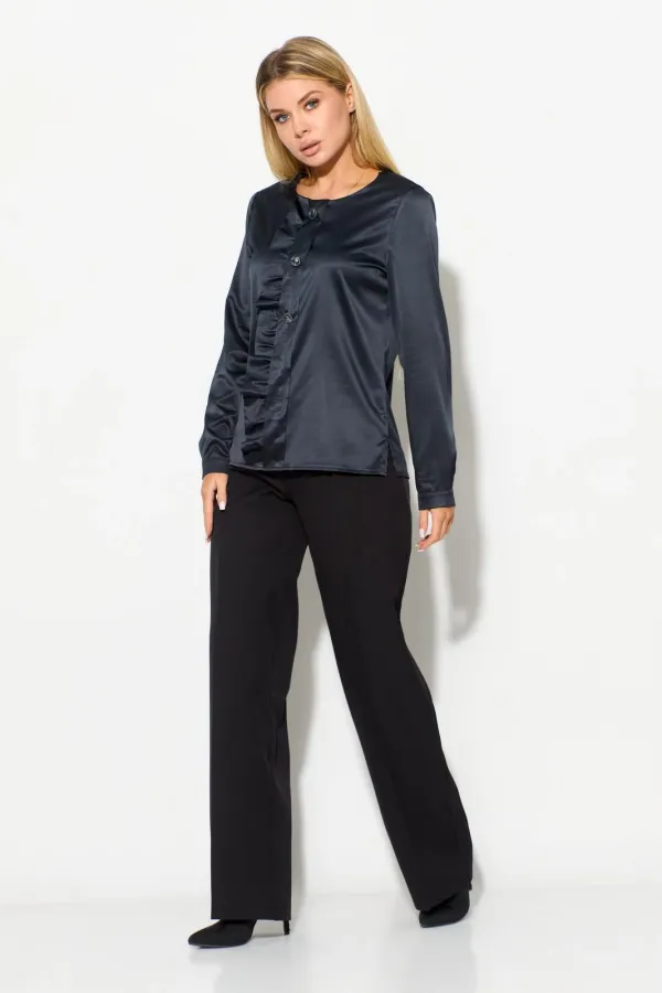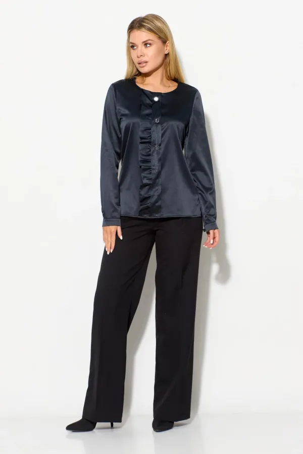 Стильная блузка офисного типа, прекрасно сочетается с брюками, юбками, жилетами. Модель полуприлегающего силуэта с круглым вырезом горловины, обработанным обтачкой, по переду декорирована элегантной планкой и валаном. В... Читать далее...