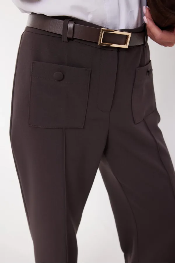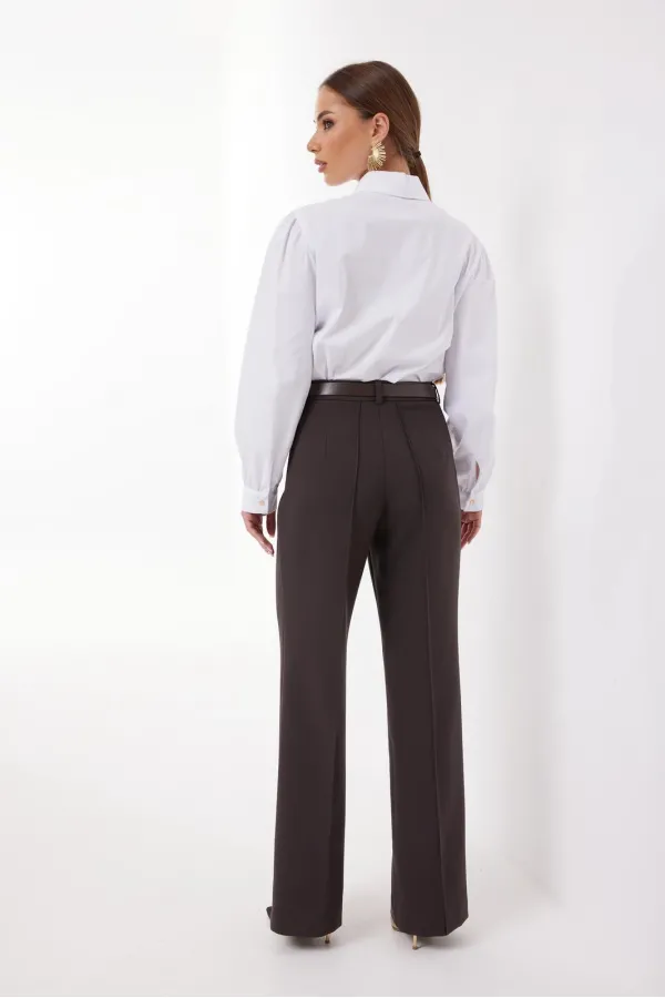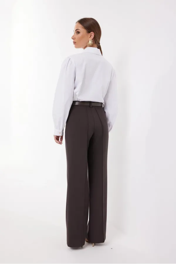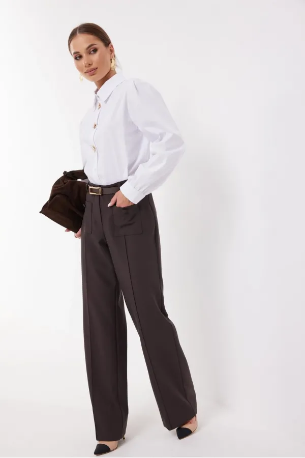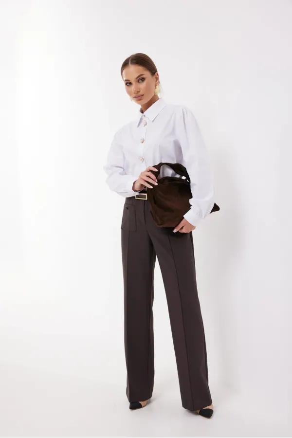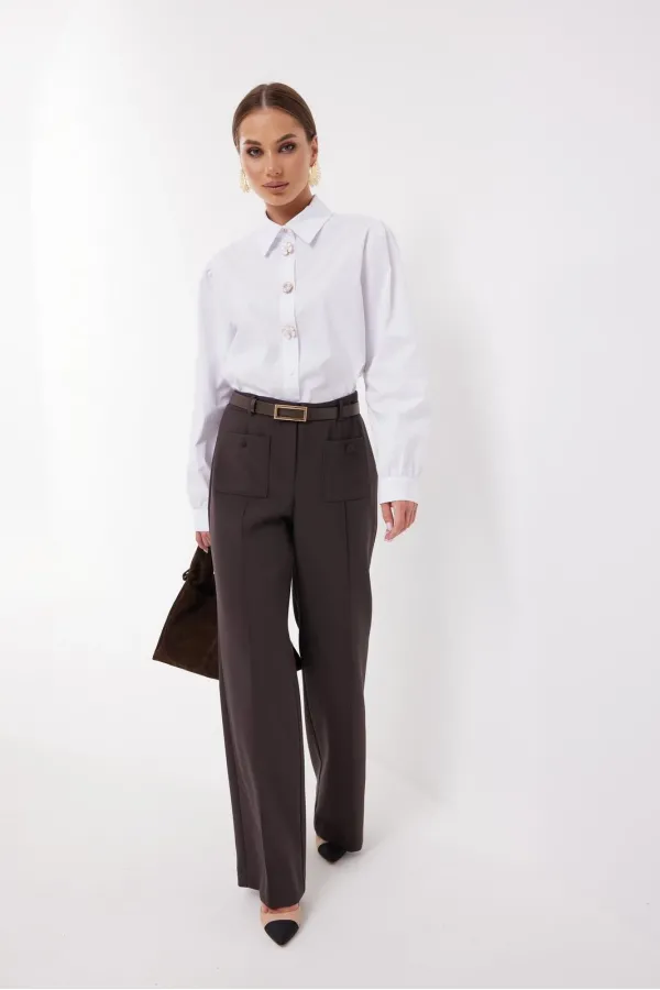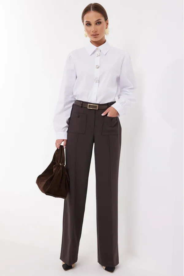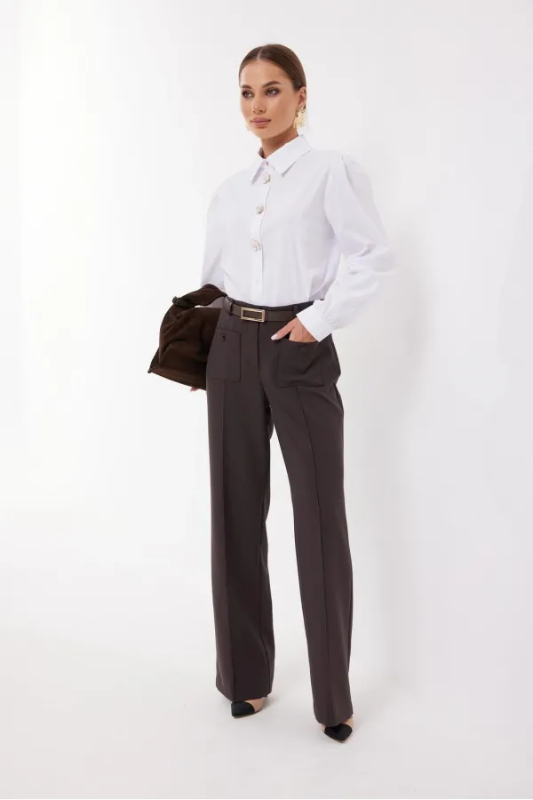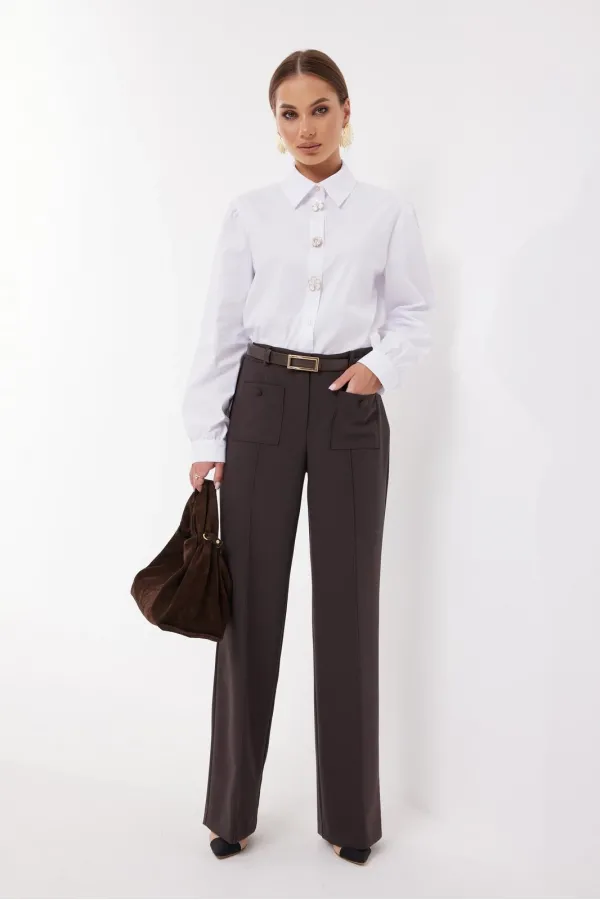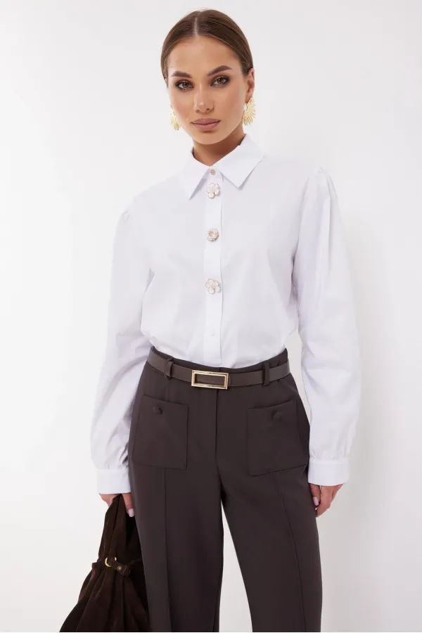 Блузка женская из рубашечной ткани, для повседневной носки, прямого силуэта с центральной застежкой на петли пуговицы. На стойке и манжетах рукава золотистые кнопки. По окату и низу рукава легкая сборка. На верхние две пуговицы пристегиваются декоративные накладки в виде цветков.