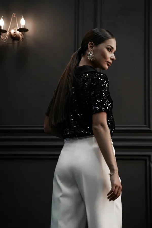 Блузка женская из трикотажного полотна в пайетки, прямого силуэта, перед джемпера с застежкой на планку с четырьмя кнопками, рукав короткий, воротник стояче-отложной. Блузка на подкладке.