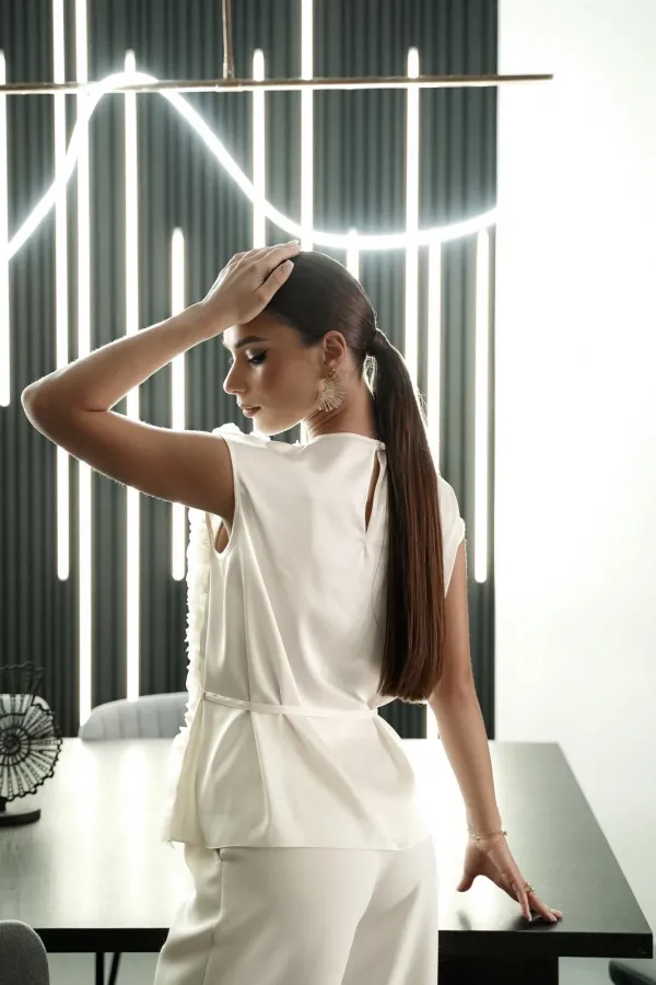 Блузка прямого силуэта со спущенным плечом. Перед из фактурной ткани «розы на сетке», спинка из полупрозрачной ткани «органза». Горловина округлой формы, по спинке застежка на навесную петлю и пуговицу. Перед на атласной подкладке.
